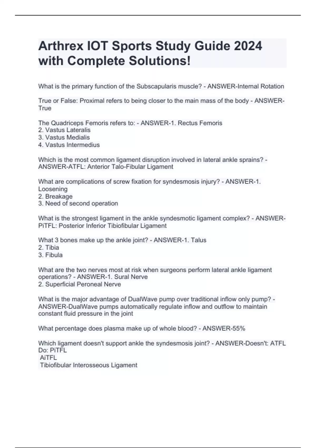 What is the primary function of the Subscapularis muscle? - ANSWER-Internal Rotation True or False: Proximal refers to being closer to the main mass of the body - ANSWER-True The Quadriceps Femoris refers to: - ANSWER-1. Rectus Femoris 2. Vastus Lateralis 3. Vastus Medialis 4. Vastus Intermedius Which is the most common ligament disruption involved in lateral ankle sprains? - ANSWER-ATFL: Anterior Talo-Fibular Ligament What are complications of screw fixation for syndesmosis injury? - ANSWER-1. Loosening 2. Breakage 3. Need of second operation What is the strongest ligament in the ankle syndesmotic ligament complex? - ANSWER-PiTFL: Posterior Inferior Tibiofibular Ligament What 3 bones make up the ankle joint? - ANSWER-1. Talus 2. Tibia 3. Fibula What are the two nerves most at risk when surgeons perform lateral ankle ligament operations? - ANSWER-1. Sural Nerve 2. Superficial Peroneal Nerve What is the major advantage of DualWave pump over traditional inflow only pump? - ANSWER-DualWave pumps automatically regulate inflow and outflow to maintain constant fluid pressure in the joint What percentage does plasma make up of whole blood? - ANSWER-55% Which ligament doesn't support ankle the syndesmosis joint? - ANSWER-Doesn't: ATFL Do: PiTFL AiTFL Tibiofibular Interosseous Ligament Spee