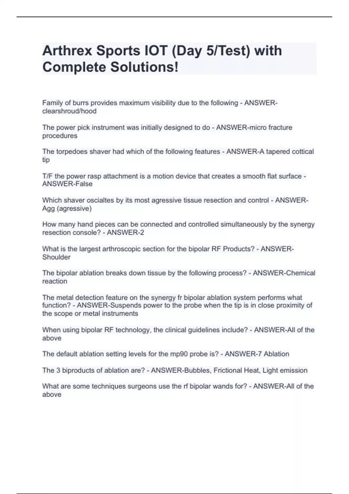 Family of burrs provides maximum visibility due to the following - ANSWER-clearshroud/hood The power pick instrument was initially designed to do - ANSWER-micro fracture procedures The torpedoes shaver had which of the following features - ANSWER-A tapered cottical tip T/F the power rasp attachment is a motion device that creates a smooth flat surface - ANSWER-False Which shaver oscialtes by its most agressive tissue resection and control - ANSWER-Agg (agressive) How many hand pieces can be connected and controlled simultaneously by the synergy resection console? - ANSWER-2 What is the largest arthroscopic section for the bipolar RF Products? - ANSWER-Shoulder The bipolar ablation breaks down tissue by the following process? - ANSWER-Chemical reaction The metal detection feature on the synergy fr bipolar ablation system performs what function? - ANSWER-Suspends power to the probe when the tip is in close proximity of the scope or metal instruments When using bipolar RF technology, the clinical guidelines include? - ANSWER-All of the above The default ablation setting levels for the mp90 probe is? - ANSWER-7 Ablation The 3 biproducts of ablation are? - ANSWER-Bubbles, Frictional Heat, Light emission What are some techniques surgeons use the rf bipolar wands for? - ANSWER-All of the above T/F when removing the orange cap and plugging in the pressure sensor is the first step into y