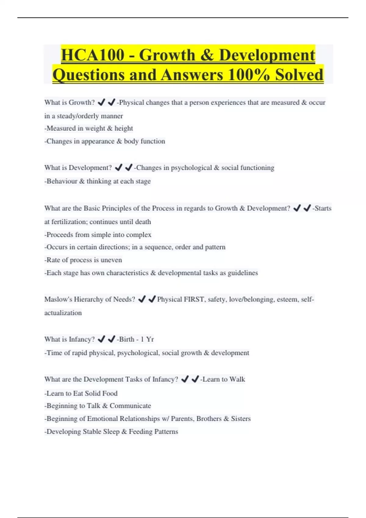 HCA100 - Growth & Development Questions and Answers 100% Solved What is Growth? ️️-Physical changes that a person experiences that are measured & occur in a steady/orderly manner -Measured in weight & height -Changes in appearance & body function What is Development? ️️-Changes in psychological & social functioning -Behaviour & thinking at each stage What are the Basic Principles of the Process in regards to Growth & Development? ️️-Starts at fertilization; continues until death -Proceeds from simple into complex -Occurs in certain directions; in a sequence, order and pattern -Rate of process is uneven -Each stage has own characteristics & developmental tasks as guidelines