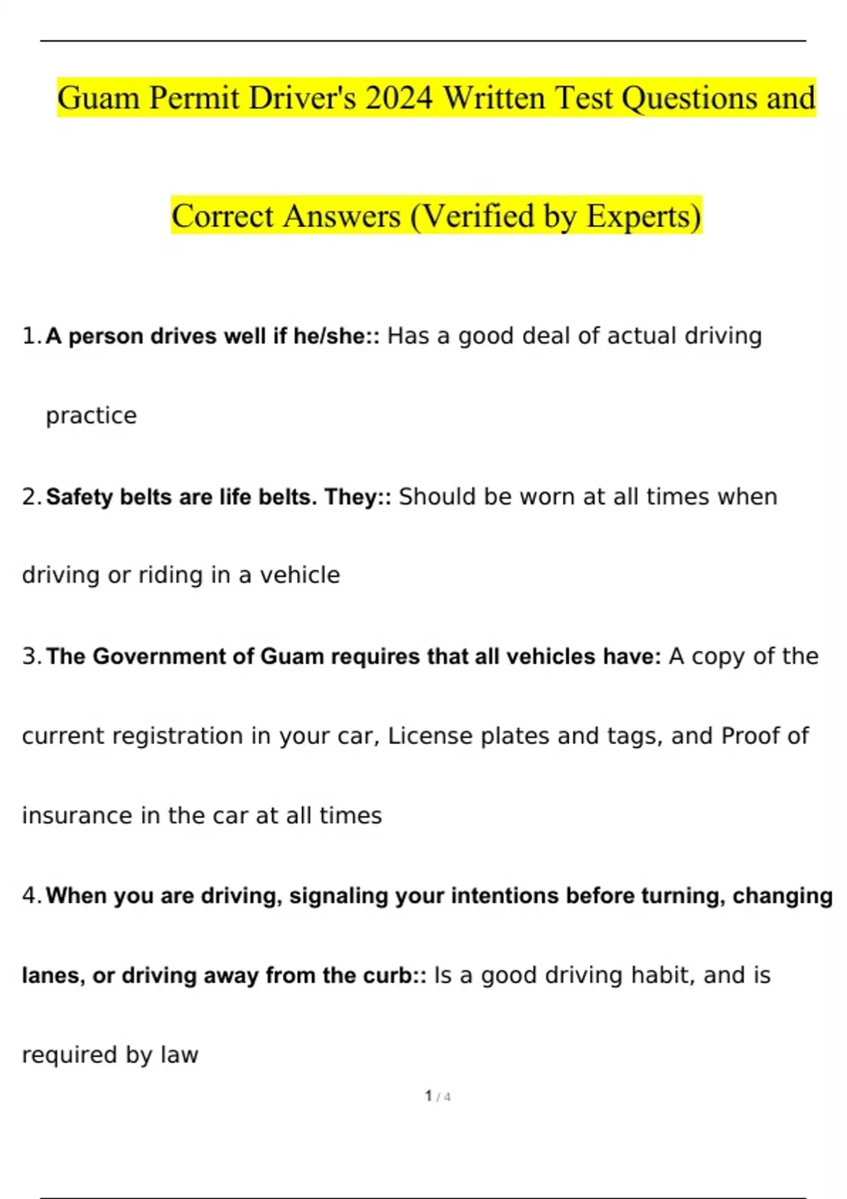 Guam Permit Driver's 2024 Written Test Questions and Answers (Verified Answers)