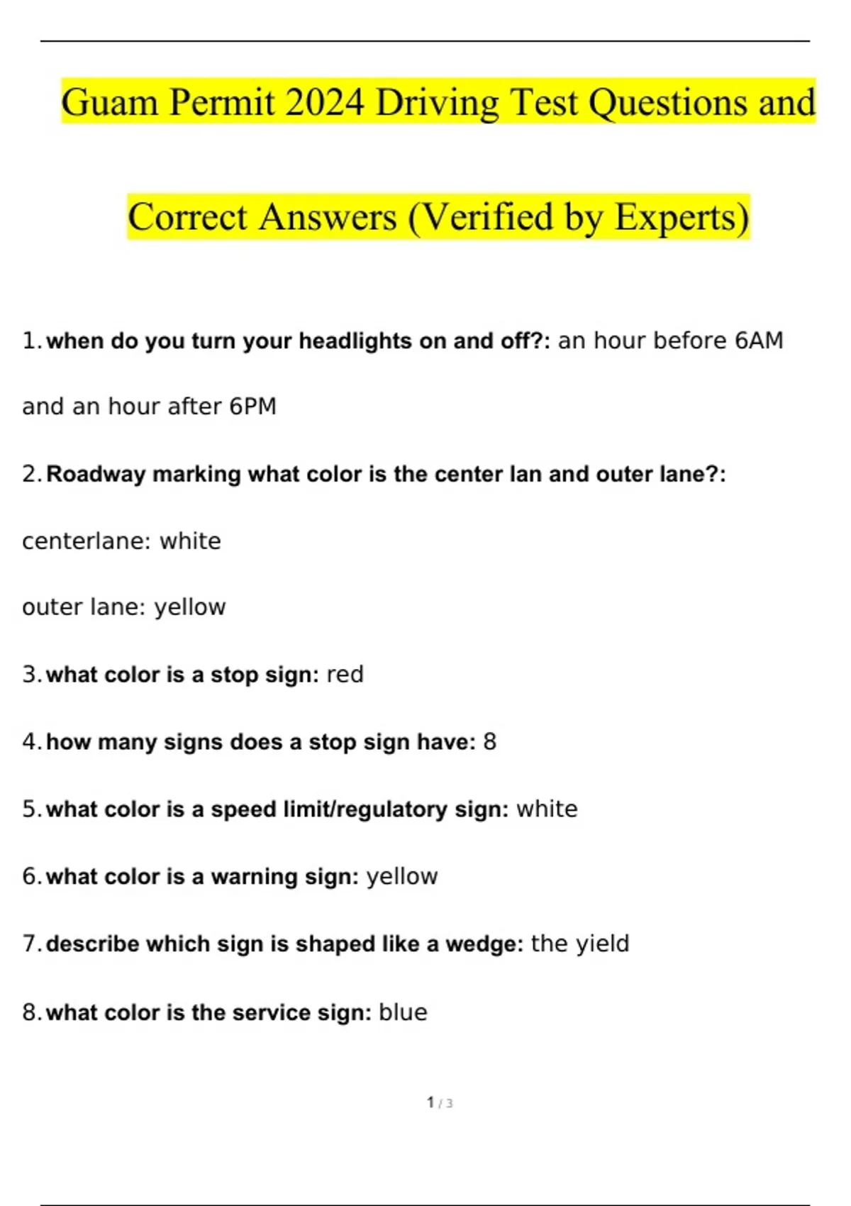 Guam Permit 2024 Driving Test Questions and Answers (Verified Answers)