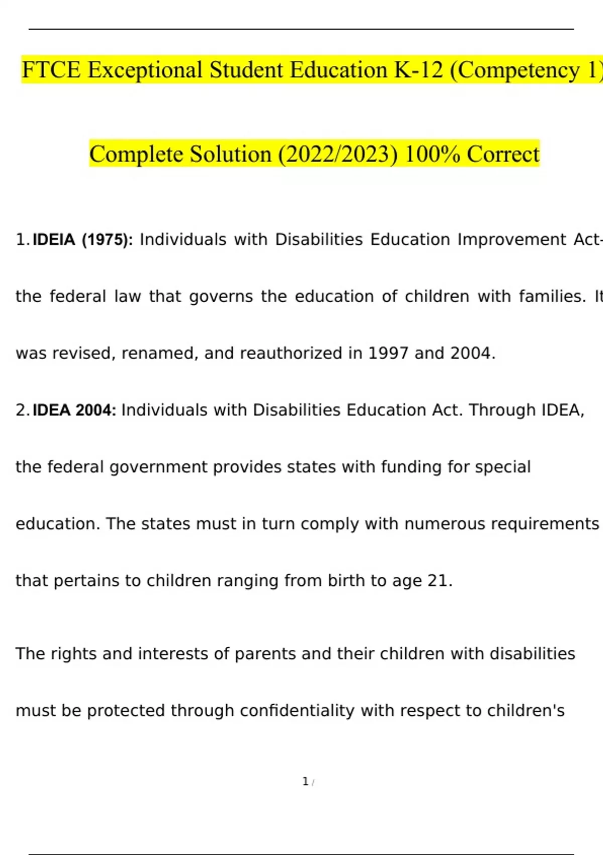 Summary FTCE Exceptional Student Education K-12 (Competency 1)Complete Solutions 2023 | 100% Verified