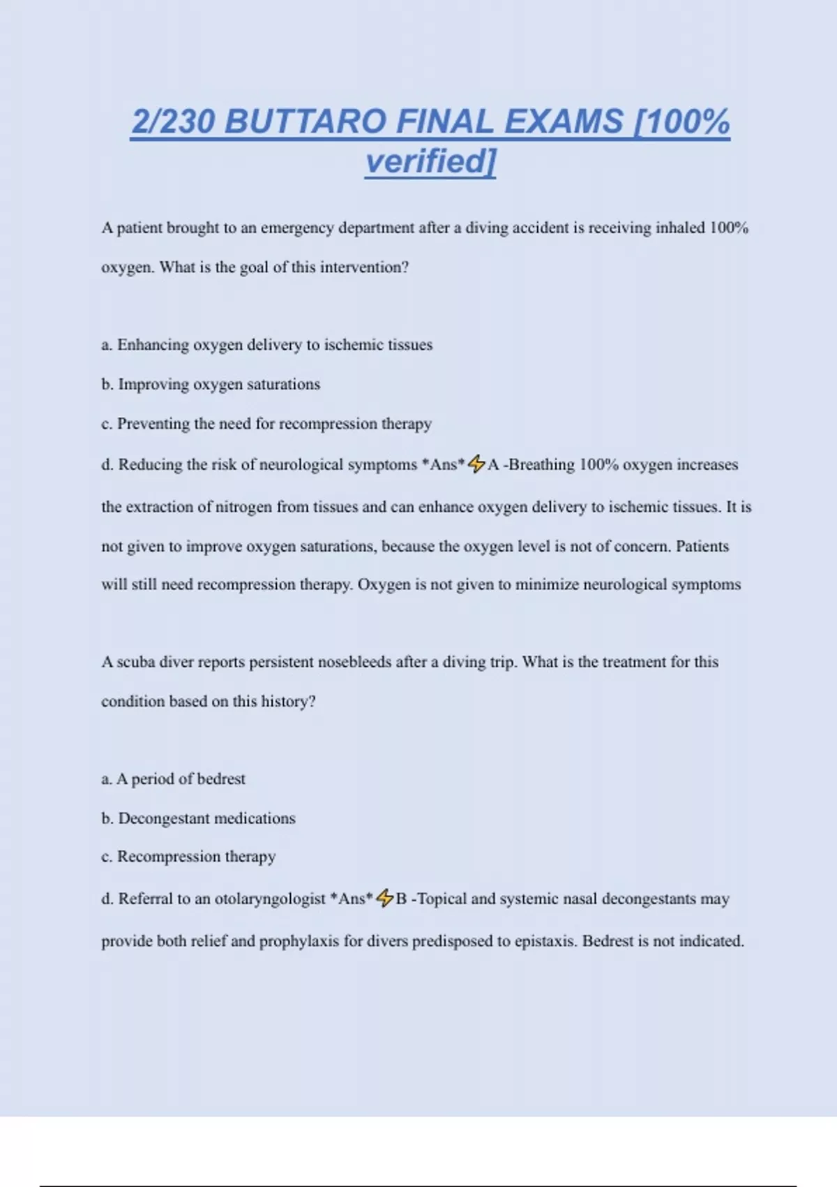 2/230 BUTTARO FINAL EXAMS [100% verified] A patient brought to an emergency department after a diving accident is receiving inhaled 100% oxygen. What is the goal of this intervention? a. Enhancing oxygen delivery to ischemic tissues b. Improving oxygen saturations c. Preventing the need for recompression therapy d. Reducing the risk of neurological symptoms *Ans* A -Breathing 100% oxygen increases the extraction of nitrogen from tissues and can enhance oxygen delivery to ischemic tissues. It is not given to improve oxygen saturations, because the oxygen level is not of concern. Patients will still need recompression therapy. Oxygen is not given to minimize neurological symptoms A scuba diver reports persistent nosebleeds after a diving trip. What is the treatment for this condition based on this history? a. A period of bedrest b. Decongestant medications c. Recompression therapy d. Referral to an otolaryngologist *Ans* B -Topical and systemic nasal decongestants may provide both relief and prophylaxis for divers predisposed to epistaxis. Bedrest is not indicated. Recompression therapy is not used for sinus barotrauma. Referral to an otolaryngologist is necessary when conservative treatments are not effective When evaluating a person who is interested in taking a scuba diving class, the practitioner will screen for which conditions? (Select all that apply.) a. Chronic sinusitis b. Diabetes mellitus c. Peptic ulcer disease d. Pressure equalizing ear tubes e. Recurrent urinary tract infection *Ans* A, B, D- Diving is relatively contraindicated in any patient with a history of frequent ear infections or chronic sinus infections. Diabetes, if unstable, is a contraindication. Pressure equalizing tubes are absolute contraindications. Peptic ulcer disease and recurrent UTI are not contraindications. A patient with poorly controlled diabetes mellitus (DM) has chronic fatigue symptoms. Which of the following is the most likely underlying cause of this patient's fatigue? a. Calorie depletion b. Decreased metabolism c. Psychological distress d. Sleep apnea *Ans* A-Patients with poorly controlled DM can have significant fluid and calorie depletion causing fatigue. Diabetes Fatigue Syndrome requires glycemic control, a