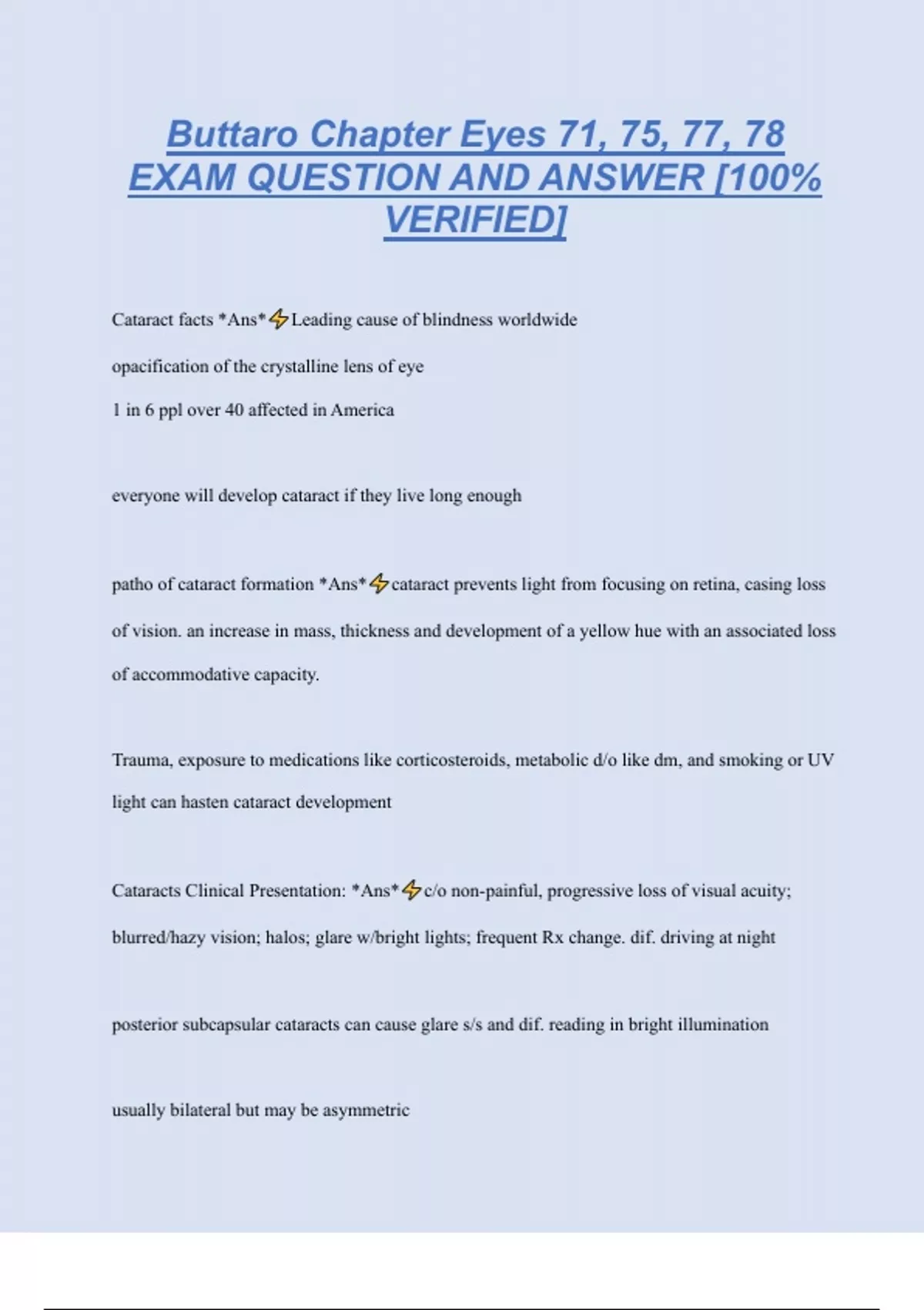 Buttaro Chapter Eyes 71, 75, 77, 78 EXAM QUESTION AND ANSWER [100% VERIFIED] Cataract facts *Ans* Leading cause of blindness worldwide opacification of the crystalline lens of eye 1 in 6 ppl over 40 affected in America everyone will develop cataract if they live long enough patho of cataract formation *Ans* cataract prevents light from focusing on retina, casing loss of vision. an increase in mass, thickness and development of a yellow hue with an associated loss of accommodative capacity. Trauma, exposure to medications like corticosteroids, metabolic d/o like dm, and smoking or UV light can hasten cataract development Cataracts Clinical Presentation: *Ans* c/o non-painful, progressive loss of visual acuity; blurred/hazy vision; halos; glare w/bright lights; frequent Rx change. dif. driving at night posterior subcapsular cataracts can cause glare s/s and dif. reading in bright illumination usually bilateral but may be asymmetric Physical Exam for cataracts *Ans* normal pupil constriction; hazy optic nerve/retina, absent/poor red light reflex does not cause corneal opacification or pain direct opthalmoscope w/ dilating the pupil focusing on the red reflex,fundoscopic exam, Differential Diagnosis for cataracts *Ans* vitreous hemorrhage, HTN retinopathy, diabetic retinopathy, corneal scar, retinal detachment, macular degeneration, neoplasm diagnostics for cataracts *Ans* none..only exam Management for cataracts *Ans* eyelass Rx changes, if ADLs significantly affected, refer for surgical removal. no medication available to reverse lens opacificatio