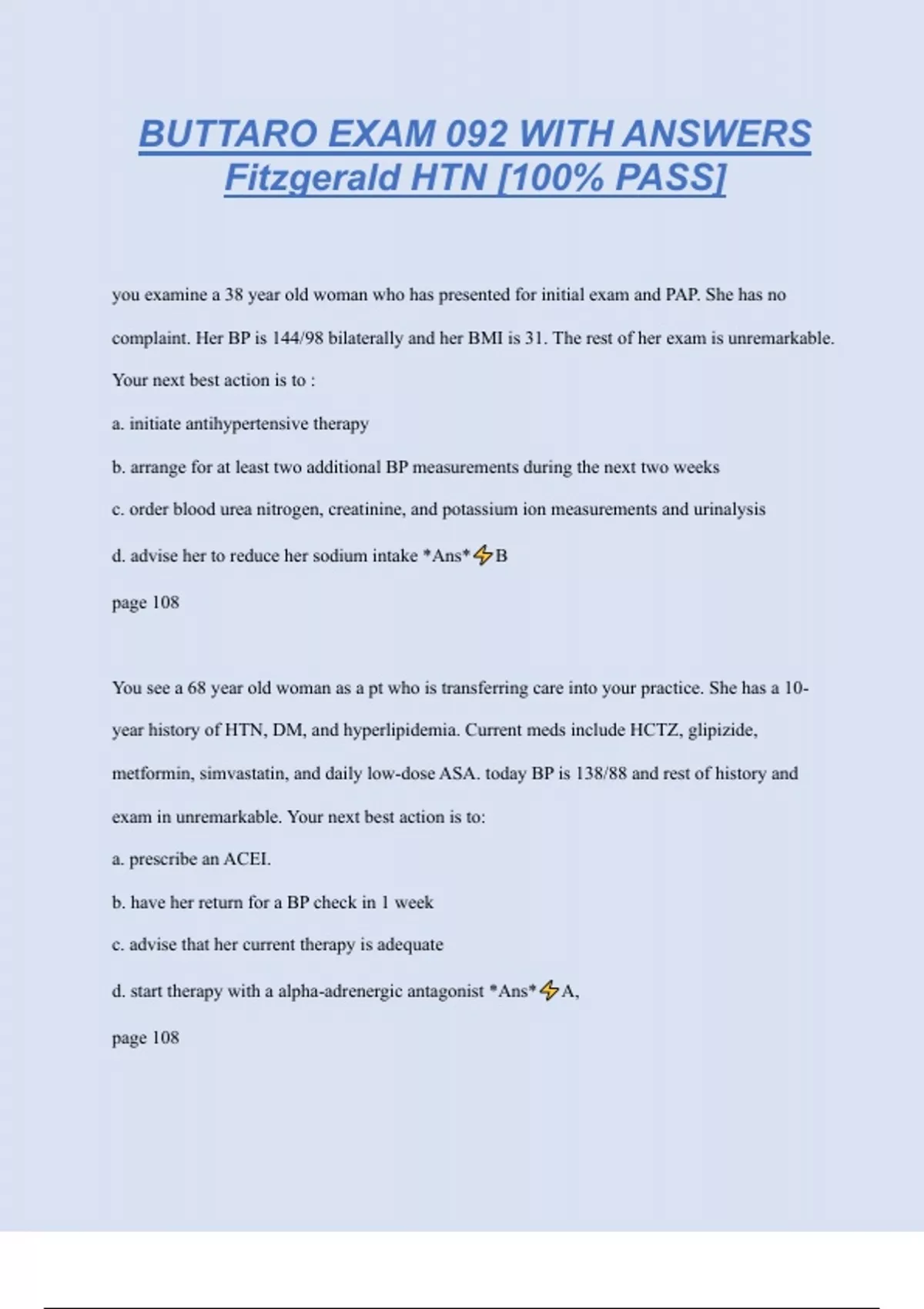 BUTTARO EXAM 092 WITH ANSWERS Fitzgerald HTN [100% PASS] you examine a 38 year old woman who has presented for initial exam and PAP. She has no complaint. Her BP is 144/98 bilaterally and her BMI is 31. The rest of her exam is unremarkable. Your next best action is to : a. initiate antihypertensive therapy b. arrange for at least two additional BP measurements during the next two weeks c. order blood urea nitrogen, creatinine, and potassium ion measurements and urinalysis d. advise her to reduce her sodium intake *Ans* B page 108 You see a 68 year old woman as a pt who is transferring care into your practice. She has a 10- year history of HTN, DM, and hyperlipidemia. Current meds include HCTZ, glipizide, metformin, simvastatin, and daily low-dose ASA. today BP is 138/88 and rest of history and exam in unremarkable. Your next best action is to: a. prescribe an ACEI. b. have her return for a BP check in 1 week c. advise that her current therapy is adequate d. start therapy with a alpha-adrenergic antagonist *Ans* A, page 108 You examine a 78 year old woman with long-standing poorly controlled HTN. when evaluating her for hypertensive target organ damage, you look for evidence of: a. lipid abnormalities b. hyperinsulinemia and insulin resistance c. left ventricular hypertrophy d. clotting disorders *Ans* C. page 109 Diagnostic testing for a patient with new stage 1 primary HTN diagnosis should include all of following except: a. hematocrit b. uric acid c. creatinine d. potassium *Ans* B page 109 In the person with HTN, which of the following would likely yield the greatest potential reduction in BP in a patient with a BMI of 30?