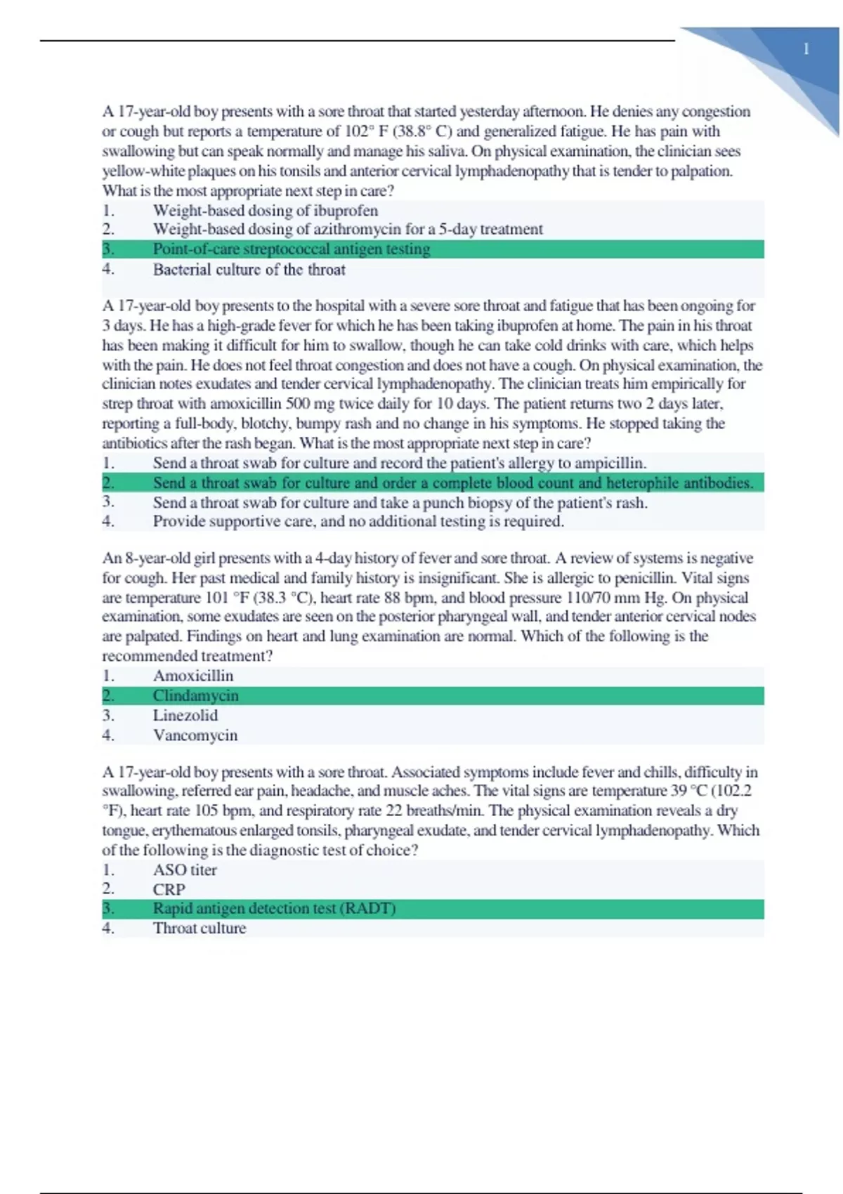 A 17-year-old boy presents with a sore throat that started yesterday afternoon. He denies any congestion or cough but reports a temperature of 102° F (38.8° C) and generalized fatigue. He has pain with swallowing but can speak normally and manage his saliva. On physical examination, the clinician sees yellow-white plaques on his tonsils and anterior cervical lymphadenopathy that is tender to palpation. What is the most appropriate next step in care? A 17-year-old boy presents to the hospital with a severe sore throat and fatigue that has been ongoing for 3 days. He has a high-grade fever for which he has been taking ibuprofen at home. The pain in his throat has been making it difficult for him to swallow, though he can take cold drinks with care, which helps with the pain. He does not feel throat congestion and does not have a cough. On physical examination, the clinician notes exudates and tender cervical lymphadenopathy. The clinician treats him empirically for strep throat with amoxicillin 500 mg twice daily for 10 days. The patient returns two 2 days later, reporting a full-body, blotchy, bumpy rash and no change in his symptoms. He stopped taking the antibiotics after the rash began. What is the most appropriate next step in care? An 8-year-old girl presents with a 4-day history of fever and sore throat. A review of systems is negative for cough. Her past medical and family history is insignificant. She is allergic to penicillin. Vital signs are temperature 101 °F (38.3 °C), heart rate 88 bpm, and blood pressure 110/70 mm Hg. On physical examination, some exudates are seen on the posterior pharyngeal wall, and tender anterior cervical nodes are palpated. Findings on heart and lung examination are normal. Which of the following is the recommended treatment? A 17-year-old boy presents with a sore throat. Associated symptoms include fever and chills, difficulty in swallowing, referred ear pain, headache, and muscle aches. The vital signs are temperature 39 °C (102.2 °F), heart rate 105 bpm, and respiratory rate 22 breaths/min. The physical examination reveals a dry tongue, erythematous enlarged tonsils, pharyngeal exudate, and tender cervical lymphadenopathy. Which of the following is the diagnostic test of choice? A 17-year-old girl presents with a thick discharge from her eyes that started 5 days ago. Associated symptoms include redness and a feeling of dirt in her eyes. Her eyes are usually matted in the morning. Her medical history is significant for multiple similar episodes. She has been using contact lenses for the past 2 years. Her vital signs are blood pressure 120/80 mm Hg, heart rate 88 bpm, respiratory rate 14 breaths/min, and temperature 37 °C (98.6 °F). An ocular examination reveals hyperemia and elevated yellow-white lesions at the lower cul-de-sac. What is the most appropriate next step in management? A 6-year-old girl is brought in with a 5-day history of sore throat and fever. Other children at school have had similar symptoms. She has not had any cough during this time. Her medical and family history is insignificant. Her vitals are currently within normal limits. On physical examination, her anterior cervical nodes are palpable and tender. There are no exudates seen on the posterior pharyngeal wall. What is the next best step in the management of this patient? A 46-year-old man presents with symptoms consistent with allergic rhinitis. He has a history of depression and is treated with a selective serotonin reuptake inhibitor. He works as a school bus driver. Which of the following should be used to treat his symptoms? A 5-year-old boy is brought for evaluation of a sore throat for the past 5 days. His parents report no cough during this period. His medical and family history is insignificant. Vitals show blood pressure 120/80 mm Hg, temperature of 100.4 °F (38 °C), and heart rate 78 bpm. On physical examination, anterior cervical nodes are palpable and tender. Exudates are seen on the posterior pharyngeal wall. A rapid antigen test was performed, which came back negative. Which of the following is the next best step in management? A 16-year-old male presents with a 2 day history of sore throat, fever, and cough. He has been experiencing difficulty swallowing food for the last two days. He has otherwise been in good health and is up to date with his immunizations. On examinations, he has a temperature of 100.6 F, pulse rate of 100 bpm, blood pressure of 110/80 mmHg. Oral exam reveals bilateral tonsillar exudates and diffuse pharyngeal erythema. Which of the following would be the next best step in the management of this patient? A 27-year-old man presents with fever, sore throat, and a generalized maculopapular erythematous rash. He reports having sexual relations with other men. His rapid antigen test for Group A beta- hemolytic streptococcus is negative. What is the next best step in the management of this patient? A 2-year-old boy presents with a fever of 102 °F (38.9 °C). His physical examination reveals bilateral otitis media with effusion with noted erythema on the right side. His parents state that this is his sixth diagnosis of otitis media in the past 12 months. His parents also note that he only has 2 words that are intelligible to them. Following the treatment of this patient for his acute otitis media, which of the following is an appropriate management strategy? Despite trying to manage a child diagnosed with otitis media with effusion conservatively, it is decided an intervention is necessary. Following consultation with an otolaryngologist, it is decided to proceed with the placement of bilateral ventilation tubes. Informed consent is obtained from the parents. Which of the following is the most likely complication of tympanostomy tube placement? A 35-year-old man with nasal congestion continues to use an over-the-counter intranasal decongestant for four weeks. He complains that he is dependant on the intranasal decongestant spray and that 