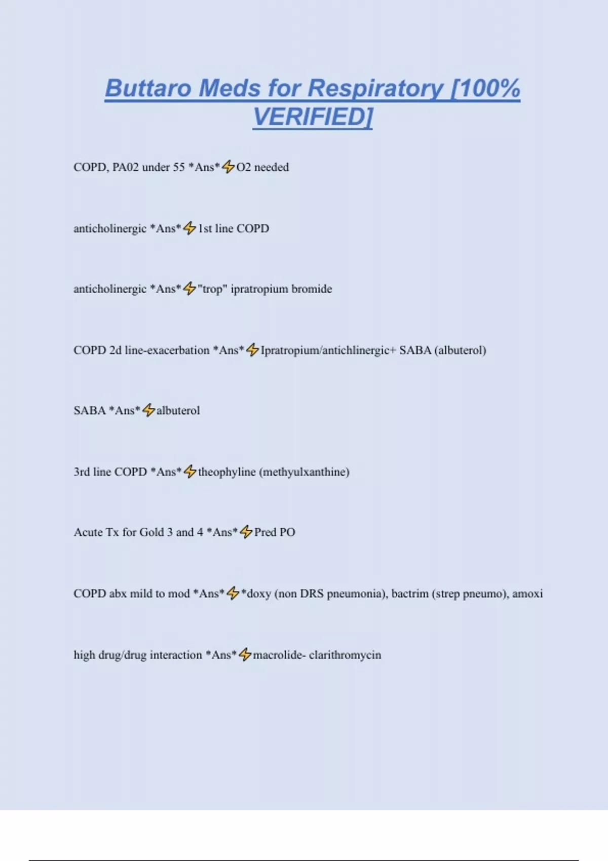 Buttaro Meds for Respiratory [100% VERIFIED] COPD, PA02 under 55 *Ans* O2 needed anticholinergic *Ans* 1st line COPD anticholinergic *Ans* "trop" ipratropium bromide COPD 2d line-exacerbation *Ans* Ipratropium/antichlinergic+ SABA (albuterol) SABA *Ans* albuterol 3rd line COPD *Ans* theophyline (methyulxanthine) Acute Tx for Gold 3 and 4 *Ans* Pred PO COPD abx mild to mod *Ans* *doxy (non DRS pneumonia), bactrim (strep pneumo), amoxi high drug/drug interaction *Ans* macrolide- clarithromycin more sever COPD abx *Ans* Cephalosporin(strep pneumo, stable beta lact), beta lactamaugmentin, macrolide (mycin), resp. flouroquinolone (levo "oxacin") (DRSP coverage) Cephalosporin *Ans* cefdirnir, cefpodocime, "ceph" oxacin *Ans* flouroquinolone macrolide *Ans* "mycin" beta lactam *Ans* cephlosporins or augmentin pertussis *Ans* macrolide/mycin "azythro or erythro -mycin" ( caution qt) acute bronchitis-middle school age *Ans* pertussis