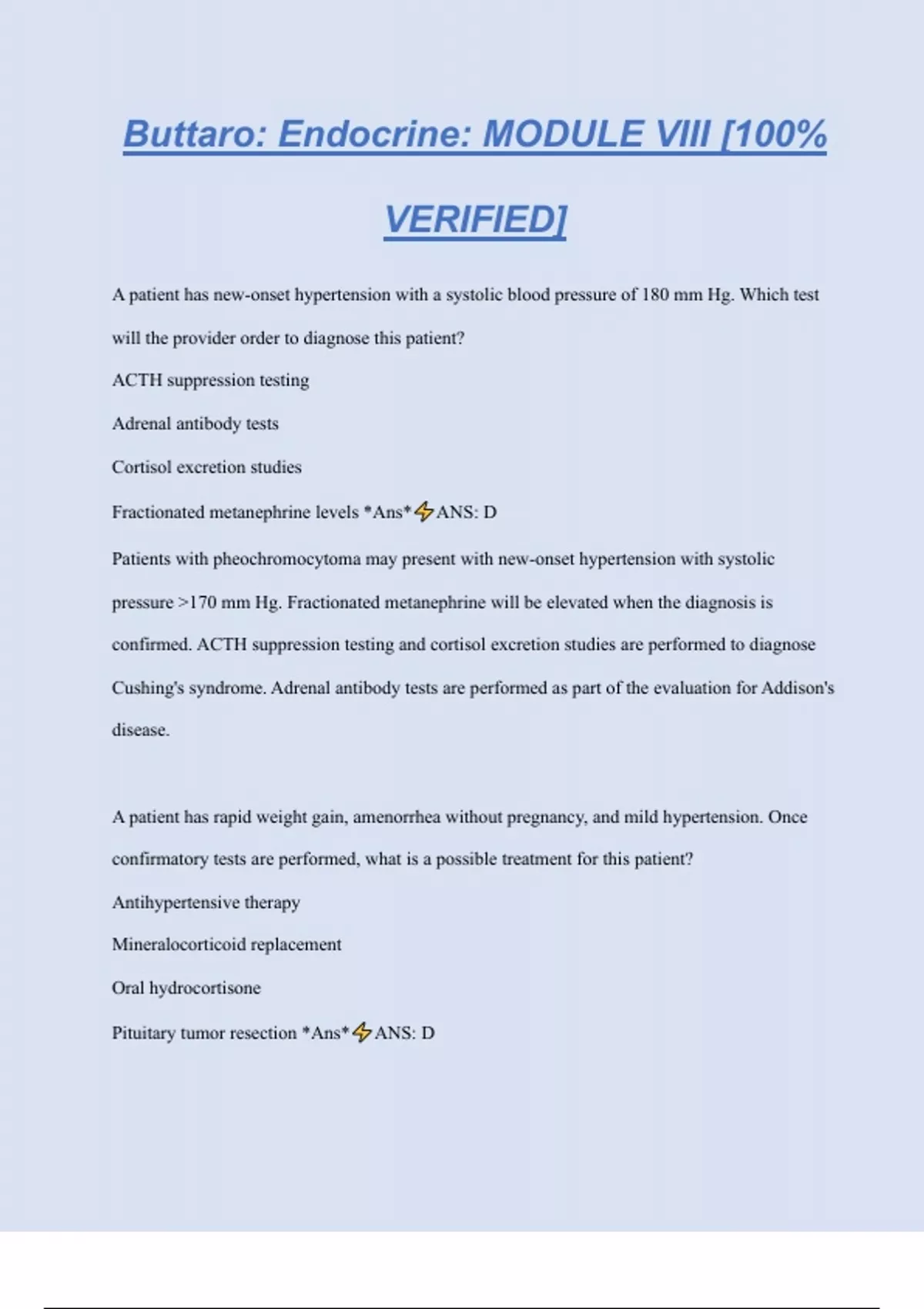 Buttaro: Endocrine: MODULE VIII [100% VERIFIED] A patient has new-onset hypertension with a systolic blood pressure of 180 mm Hg. Which test will the provider order to diagnose this patient? ACTH suppression testing Adrenal antibody tests Cortisol excretion studies Fractionated metanephrine levels *Ans* ANS: D Patients with pheochromocytoma may present with new-onset hypertension with systolic pressure >170 mm Hg. Fractionated metanephrine will be elevated when the diagnosis is confirmed. ACTH suppression testing and cortisol excretion studies are performed to diagnose Cushing's syndrome. Adrenal antibody tests are performed as part of the evaluation for Addison's disease. A patient has rapid weight gain, amenorrhea without pregnancy, and mild hypertension. Once confirmatory tests are performed, what is a possible treatment for this patient? Antihypertensive therapy Mineralocorticoid replacement Oral hydrocortisone Pituitary tumor resection *Ans* ANS: D This patient has symptoms of Cushing's syndrome. When indicated, pituitary tumor resection is performed as the first choice. Antihypertensive therapy is initiated in patients with pheochromocytoma. Mineralocorticoids and glucocorticoids are given to patients with Addison's disease. A patient has unexplained weight loss and the provider notes increased skin pigmentation on light-exposed skin folds along with darkened palmar creases. Which laboratory tests will the provider order? (Select all that apply.) Serum ACTH Serum cortisol Serum electrolytes TB skin testing Urine cortisol *Ans* ANS: A, C, D This patient has symptoms of Addison's disease. Serum ACTH will be elevated in patients with Addison's disease. Hyponatremia and hyperkalemia may occur and are sometimes the initial finding. TB skin testing is done to exclude tuberculosis. Serum and urine cortisol levels are evaluated with Cushing's syndrome is suspected. An obese adolescent female patient reports irregular periods and excessive acne. The provider notes an increased amount of hair on her upper back, shoulders, and upper abdomen. What will the provider do, based on these findings? Consider treatment with oral contraceptive pills (OCPs) Counsel her about diet, exercise, and weight loss Recommend cosmetic laser hair removal Refer to an endocrinologist for evaluation *Ans* ANS: