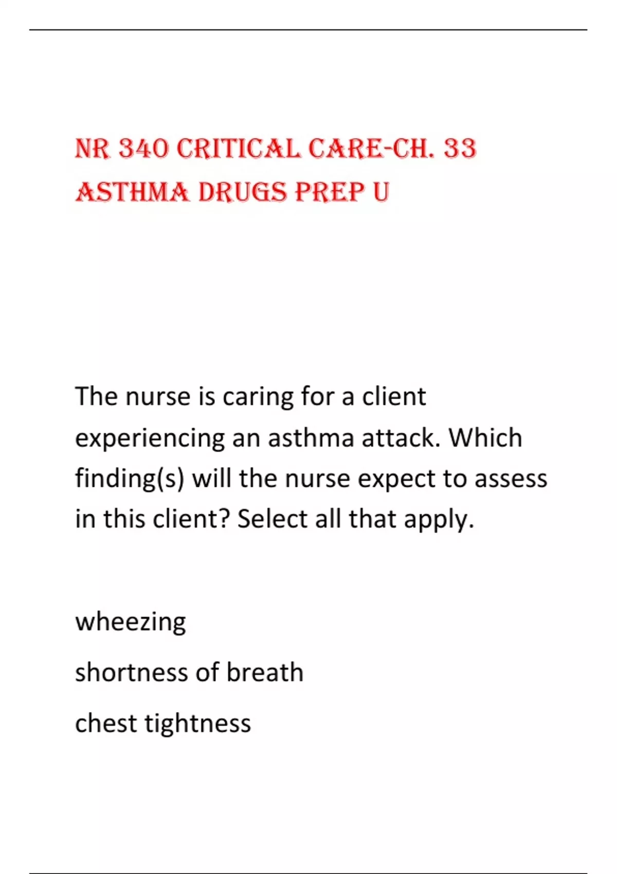 NR 340 CRITICAL CARE (SEPSIS) LATEST REVIEW EXAM Q & A 2024.-Prep U: Chapter 33=Drug Therapy for Asthma & Bronchoconstriction