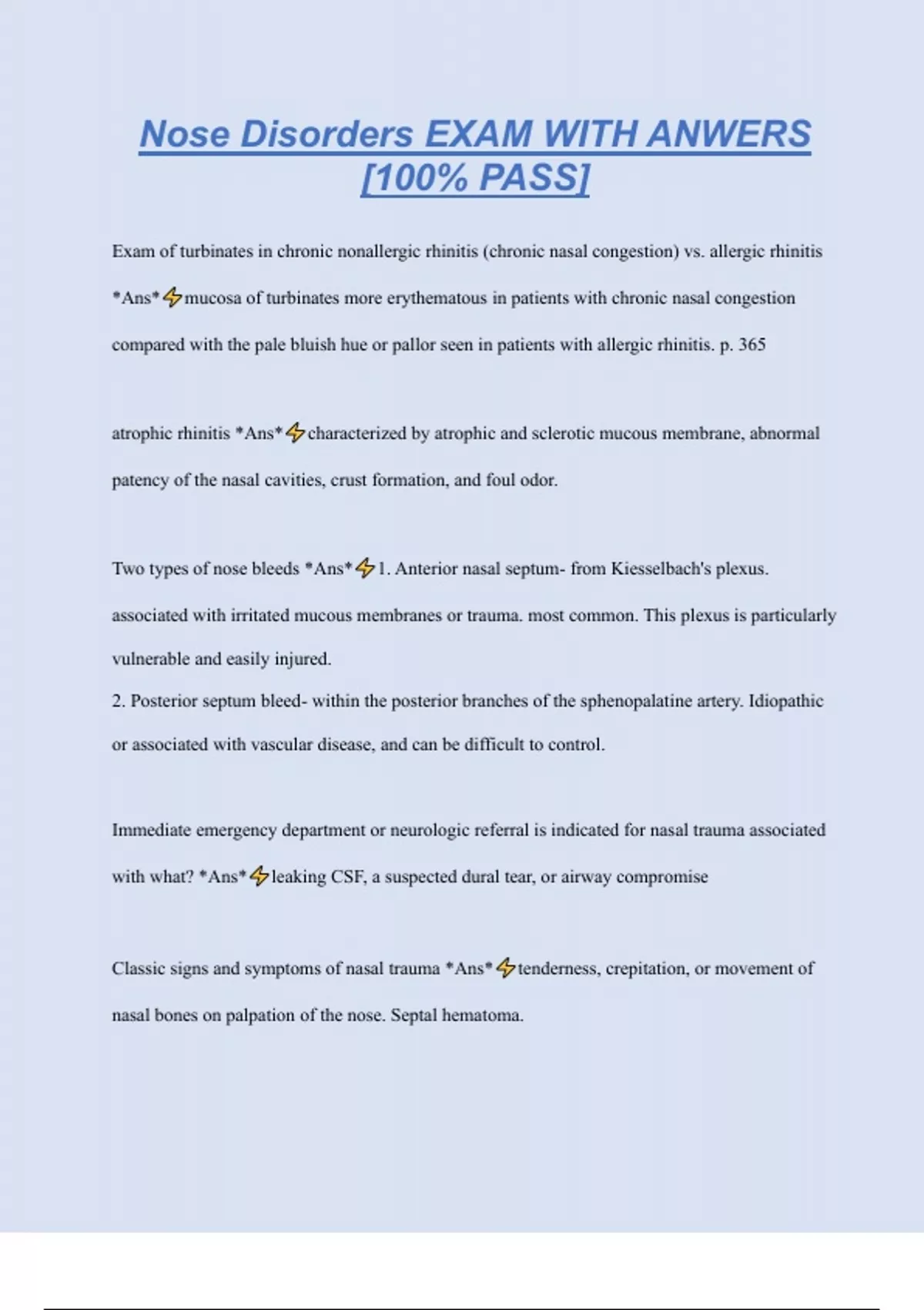 Nose Disorders EXAM WITH ANWERS [100% PASS] Exam of turbinates in chronic nonallergic rhinitis (chronic nasal congestion) vs. allergic rhinitis *Ans* mucosa of turbinates more erythematous in patients with chronic nasal congestion compared with the pale bluish hue or pallor seen in patients with allergic rhinitis. p. 365 atrophic rhinitis *Ans* characterized by atrophic and sclerotic mucous membrane, abnormal patency of the nasal cavities, crust formation, and foul odor. Two types of nose bleeds *Ans* 1. Anterior nasal septum- from Kiesselbach's plexus. associated with irritated mucous membranes or trauma. most common. This plexus is particularly vulnerable and easily injured. 2. Posterior septum bleed- within the posterior branches of the sphenopalatine artery. Idiopathic or associated with vascular disease, and can be difficult to control. Immediate emergency department or neurologic referral is indicated for nasal trauma associated with what? *Ans* leaking CSF, a suspected dural tear, or airway compromise Classic signs and symptoms of nasal trauma *Ans* tenderness, crepitation, or movement of nasal bones on palpation of the nose. Septal hematoma. With seasonal or recurrent sneezing, disturbances of taste or smell, nasal congestion, dry mouth, postnasal drainage, and fatigue suspect what? *Ans* allergic rhinitis Exam of patient with allergic rhinitis may find... *Ans* pale nasal mucosa, swollen turbinates w/bleeding, mucus, crusting, and other signs of inflammation; enlarged tonsils; postnasal drip; "allergic salute" crease across the nose; and conjunctival irritation. immunotherapy *Ans* a long-term treatment of allergic rhinitis. May be effective if occupational exposures cannot be avoided and is generally considered if symptoms are present for more than 6 months, if symptoms are not relieved by environmental control and pharmacologic agents and if the cost of immunotherapy is less than that of pharmacologic therapy. injections are given every week in progressively increasing doses until a maintenance dose is achieved; after that injections given monthly. Not recommended for patent's receiving beta blocker therapy. Can have a generalized or systemic reaction. Wait in office for 30 mins and carry epi pen