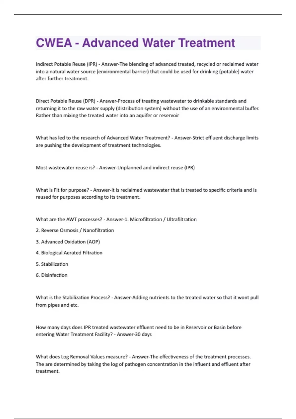 Indirect Potable Reuse (IPR) - Answer-The blending of advanced treated, recycled or reclaimed water into a natural water source (environmental barrier) that could be used for drinking (potable) water after further treatment. Direct Potable Reuse (DPR) - Answer-Process of treating wastewater to drinkable standards and returning it to the raw water supply (distribution system) without the use of an environmental buffer. Rather than mixing the treated water into an aquifer or reservoir What has led to the research of Advanced Water Treatment? - Answer-Strict effluent discharge limits are pushing the development of treatment technologies. Most wastewater reuse is? - Answer-Unplanned and indirect reuse (IPR) What is Fit for purpose? - Answer-It is reclaimed wastewater that is treated to specific criteria and is reused for purposes according to its treatment. What are the AWT processes? - Answer-1. Microfiltration / Ultrafiltration 2. Reverse Osmosis / Nanofiltration 3. Advanced Oxidation (AOP) 4. Biological Aerated Filtration 5. Stabilization 6. Disinfection What is the Stabilization Process? - Answer-Adding nutrients to the treated water so that it wont pull from pipes and etc. How many days does IPR treated wastewater effluent need to be in Reservoir or Basin before entering Water Treatment Facility? - Answer-30 days What does Log Removal Values measure? - Answer-The effectiveness of the treatment processes. The are determined by taking the log of pathogen concentration in the influent and effluent after treatment.What are the 3 water quality requirements? - Answer-1. Nutrients 2. Aesthetics 3. Risk to human health, such as pathogen removal What are our primary sources of water? - Answer-Surface Water and Ground Water. During Indirect Potable reuse, how long must water stay in a natural body of water before being used for drinking water? - Answer-30 days. Who dictates wastewater reuse? - Answer-The State sets their regulations. EPA is not involved. Who regulates the drinking water? - Answer-Safe Drinking Water Act. What are the California Reuse Regulations? - Answer-A 12-10-10 log removal for Viruses, Cryptosporidium and Giardia. What can we use to disinfect water? - Answer-Chlorine, ozone, and UV. Benefits of Advanced Oxidation Process? - Answer-Removed Total Organic Carbons and creates a barrier for microorganisms. How much Total Organic Carbon (TOC) and Conductivity can Reverse Osmosis remove? - Answer-< 0.5mg/l TOC and 250mg/l conductivity. MF, RO, UV/H2O2 is an example of what? - Answer-MULTIPLE BARRIER TO PATHOGENS What are Critical Control Points (CCP)? - Answer-They are unit processes that require policies, procedures, practices, monitor and measuring to assure quality requirements are met