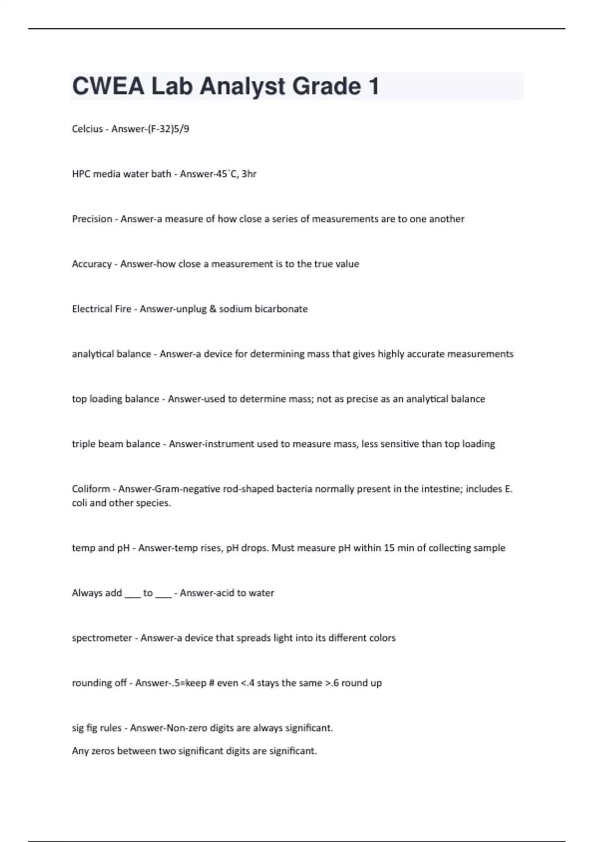 Celcius - Answer-(F-32)5/9 HPC media water bath - Answer-45`C, 3hr Precision - Answer-a measure of how close a series of measurements are to one another Accuracy - Answer-how close a measurement is to the true value Electrical Fire - Answer-unplug & sodium bicarbonate analytical balance - Answer-a device for determining mass that gives highly accurate measurements top loading balance - Answer-used to determine mass; not as precise as an analytical balance triple beam balance - Answer-instrument used to measure mass, less sensitive than top loading Coliform - Answer-Gram-negative rod-shaped bacteria normally present in the intestine; includes E. coli and other species. temp and pH - Answer-temp rises, pH drops. Must measure pH within 15 min of collecting sample Always add ___ to ___ - Answer-acid to water spectrometer - Answer-a device that spreads light into its different colors rounding off - Answer-.5=keep # even <.4 stays the same >.6 round up sig fig rules - Answer-Non-zero digits are always significant. Any zeros between two significant digits are significant.A final zero or trailing zeros in the decimal portion ONLY are significant. adding sig figs - Answer-smallest number of decimals Alkalinity hold time - Answer-14 days COD hold time - Answer-28 days