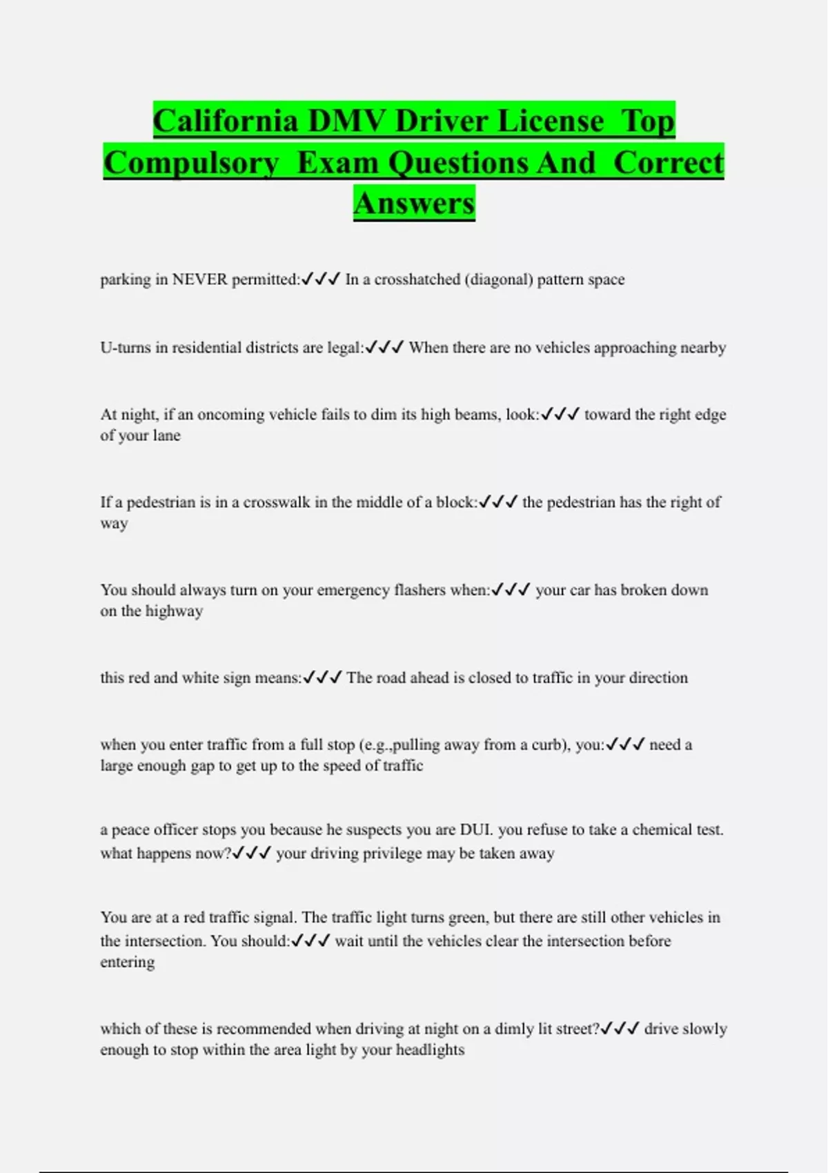 California DMV Driver License Top Compulsory Exam Questions And Correct Answers