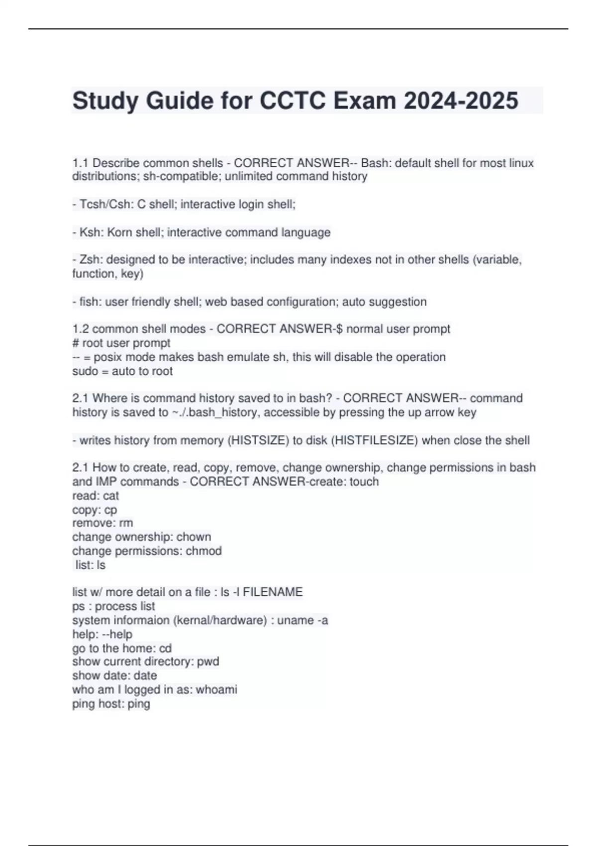 Study Guide for CCTC Exam 1.1 Describe common shells - CORRECT ANSWER-- Bash: default shell for most linux distributions; sh-compatible; unlimited command history - Tcsh/Csh: C shell; interactive login shell; - Ksh: Korn shell; interactive command language - Zsh: designed to be interactive; includes many indexes not in other shells (variable, function, key) - fish: user friendly shell; web based configuration; auto suggestion 1.2 common shell modes - CORRECT ANSWER-$ normal user prompt # root user prompt -- = posix mode makes bash emulate sh, this will disable the operation sudo = auto to root 2.1 Where is command history saved to in bash? - CORRECT ANSWER-- command history is saved to ~./.bash_history, accessible by pressing the up arrow key - writes history from memory (HISTSIZE) to disk (HISTFILESIZE) when close the shell 2.1 How to create, read, copy, remove, change ownership, change permissions in bash and IMP commands - CORRECT ANSWER-create: touch read: cat copy: cp remove: rm change ownership: chown change permissions: chmod list: ls list w/ more detail on a file : ls -l FILENAME ps : process list system informaion (kernal/hardware) : uname -a help: --help go to the home: cd show current directory: pwd show date: date who am I logged in as: whoami ping host: ping get whois infor for a domain: whois domain list netwoor connections: netstat