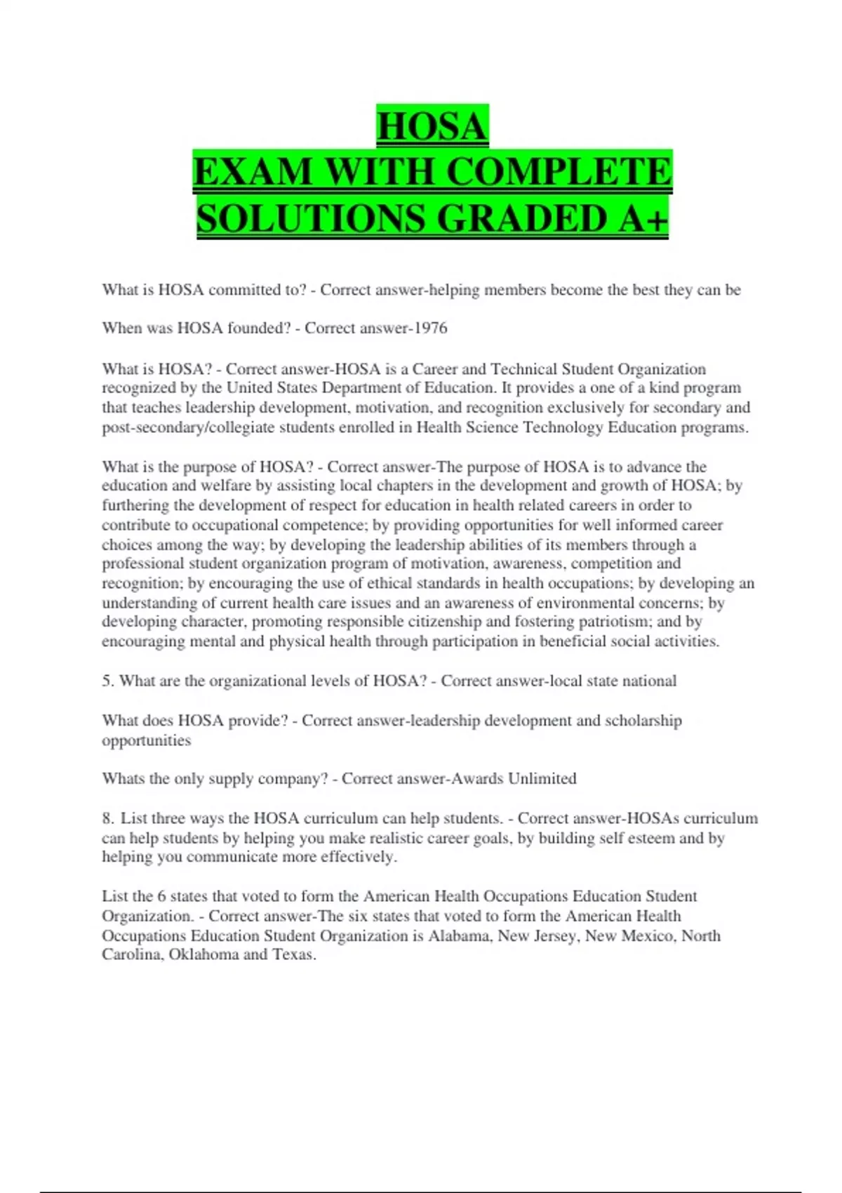 HOSA EXAM WITH COMPLETE SOLUTIONS GRADED A+ What is HOSA committed to? - Correct answer-helping members become the best they can be When was HOSA founded? - Correct answer-1976 What is HOSA? - Correct answer-HOSA is a Career and Technical Student Organization recognized by the United States Department of Education. It provides a one of a kind program that teaches leadership development, motivation, and recognition exclusively for secondary and post-secondary/collegiate students enrolled in Health Science Technology Education programs. What is the purpose of HOSA? - Correct answer-The purpose of HOSA is to advance the education and welfare by assisting local chapters in the development and growth of HOSA; by furthering the development of respect for education in health related careers in order to contribute to occupational competence; by providing opportunities for well informed career choices among the way; by developing the leadership abilities of its members through a professional student organization program of motivation, awareness, competition and recognition; by encouraging the use of ethical standards in health occupations; by developing an understanding of current health care issues and an awareness of environmental concerns; by developing character, promoting responsible citizenship and fostering patriotism; and by encouraging mental and physical health through participation in beneficial social activities. 5. What are the organizational levels of HOSA? - Correct answer-local state national What does HOSA provide? - Correct answer-leadership development and scholarship opportunities