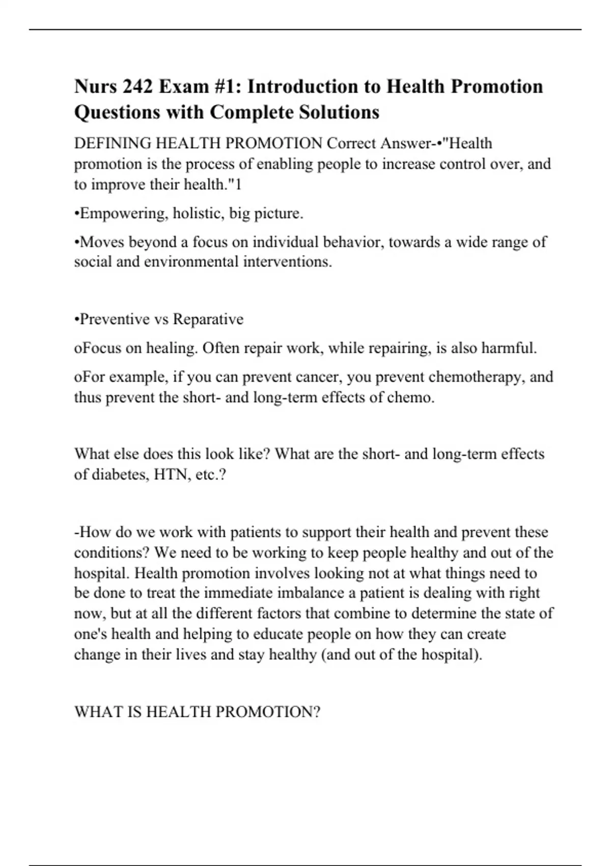 Nurs 242 Exam #1: Introduction to Health Promotion Questions with Complete Solutions