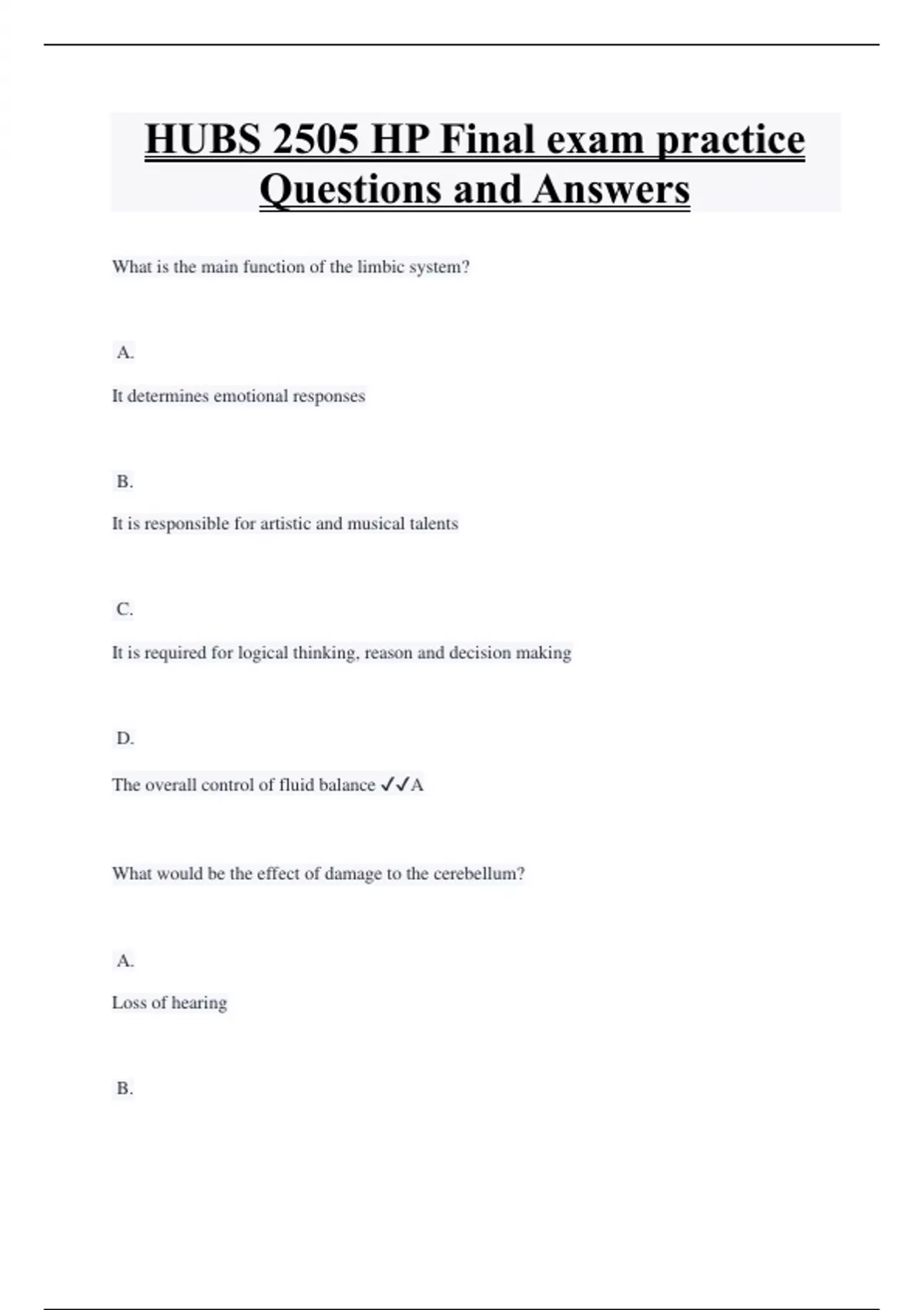 HUBS 2505 HP Final exam practice Questions and Answers What is the main function of the limbic system? A. It determines emotional responses B. It is responsible for artistic and musical talents C. It is required for logical thinking, reason and decision making D. The overall control of fluid balance A What would be the effect of damage to the cerebellum? A. Loss of hearing