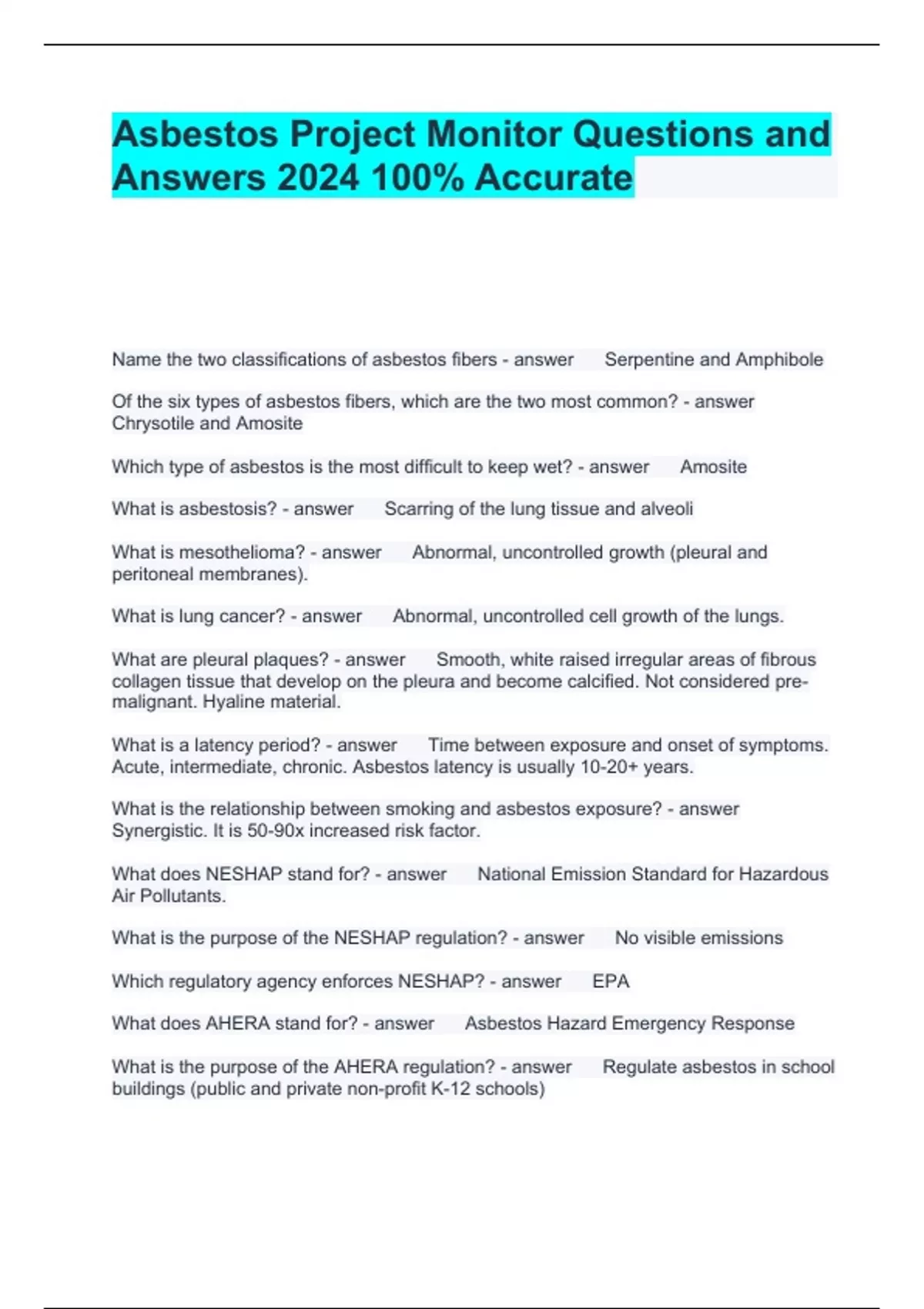 Asbestos Project Monitor Questions and Answers 2024 100% Accurate Name the two classifications of asbestos fibers Serpentine and Amphibole Of the six types of asbestos fibers, which are the two most common? Chrysotile and Amosite Which type of asbestos is the most difficult to keep wet? Amosite What is asbestosis? Scarring of the lung tissue and alveoli What is mesothelioma? Abnormal, uncontrolled growth (pleural and peritoneal membranes). What is lung cancer? Abnormal, uncontrolled cell growth of the lungs. What are pleural plaques? Smooth, white raised irregular areas of fibrous collagen tissue that develop on the pleura and become calcified. Not considered pre-malignant. Hyaline material. What is a latency period? Time between exposure and onset of symptoms. Acute, intermediate, chronic. Asbestos latency is usually 10-20+ years. What is the relationship between smoking and asbestos exposure? Synergistic. It is 50-90x increased risk factor. What does NESHAP stand for? National Emission Standard for Hazardous Air Pollutants. What is the purpose of the NESHAP regulation? No visible emissions Which regulatory agency enforces NESHAP? EPA What does AHERA stand for? Asbestos Hazard Emergency Response What is the purpose of the AHERA regulation? Regulate asbestos in school buildings (public and private non-profit K-12 schools) Which regulatory agency enforces AHERA? EPA What does OSHA stand for? Occupational Safety and Health Administration What is OSHA's purpose? To protect the employee/worker. What is the PEL (acronym)? Permissible Exposure Limit What number is associated with the excursion limit (EL)? 1.0 f/cc What is the 8-hour TWA for PEL? 0.1 f/cc What is the standard for asbestos clearance? 0.01 f/cc Does OSHA have a clearance limit requirement for containments? No, AHERA and individual states do. Name the five asbestos control techniques. Removal, encapsulation, enclosure, repair, and O&M Explain the removal technique. Taking away the hazardous material Explain the encapsulation technique. Covering with a liquid barrier that hardens. What are the two types of encapsulation techniques? Bridging and Penetration Explain the enclosure technique. sealing it behind a solid barrier (6-sided) Explain the repair technique. returning something to an intact or undamaged position (must repair prior to enclosure or encapsulation) Explain the operations and maintenance technique? (O&M) system of practices and procedures designed to keep asbestos in an intact position. How far should the poly overlap on the floors and walls? 12 inches What is the order of the decon from the work area out? Equipment room (dirty room), air lock, shower room, air lock, clean room Massachusetts allows exceptions to poly covering if: Glovebags are used, for surfaces that are being abated, and surfaces that are impervious. Walls should have at least ___layer(s) of ____ mil poly on them. 1 layer of 4 mil poly Floors should have ____ layer(s) of ____ mil poly on them. 2 layers of 6 mil poly Ceilings should have ____ layer(s) of ____mil poly on them. 2 layers of 4 mil poly HVAC systems should have ___ layer(s) of ___mil poly on them. 2 layers of 6 mil poly AND be shut off. If glovebags are used, what covering does the floor need to have? 1 layer of 6 mil poly. How often should air be changed inside containment? 4 times per hour or every 15 minutes What are the advantages of using a Negative Air Pressure Enclosure? 1. Contains fibers 2. Lowers concentration 3. Improve final cleanup 4. Increase worker comfort by moving air and decreasing humidity How do you determine the number of negative air machines needed? (L x W x H)/ (15 x MC) Where do you put the negative air machines? Furthest from the decon unit What are the reasons we use pre-filters? To protect the more expensive HEPA filter. What are two advantages of wet removal? 1. keeps fibers down 2. aids in cleaning What is the most used method of ceiling removal? Wet, scrape, clean What are two ways to remove pipe insulation? 1. Glove bag 2. Full containment What are the four types of respirators? 1. Air purifying 2. Powered Air Purifying 3. Supplied Air 4. Self-Contained breathing apparatus What are the two types of fit testing? Qualitative (QLFT) and Quantitative (QNFT) What are the four types of challenge agents used for qualitative fit tests? 1. Isoamyl acetate (IAA, smells like bananas) 2. Saccharin 3. Bitrex 4. Irritant smoke What is the most important aspect of the respirator? How well it fits you What is the minimum level of oxygen required for breathing? 19.5%