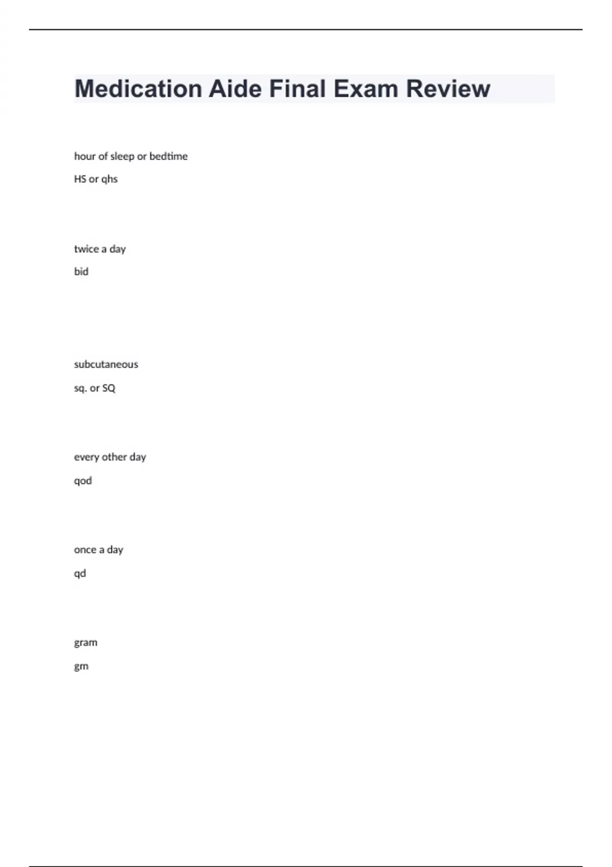 Medication Aide Final Exam Reviewhour of sleep or bedtime HS or qhs twice a day bid subcutaneous sq. or SQ every other day qod once a day qd gram gm milligram mg after meals PC OTC over the counter by mouth po; PO teaspoonful tsp before meals AC, ac as needed prn every q four times a day QID, qid three times daily TID, tid milliliter mL ounce oz tablespoonful tbsp medication administration record MAR the following abbreviations are drug routes except: a. PO