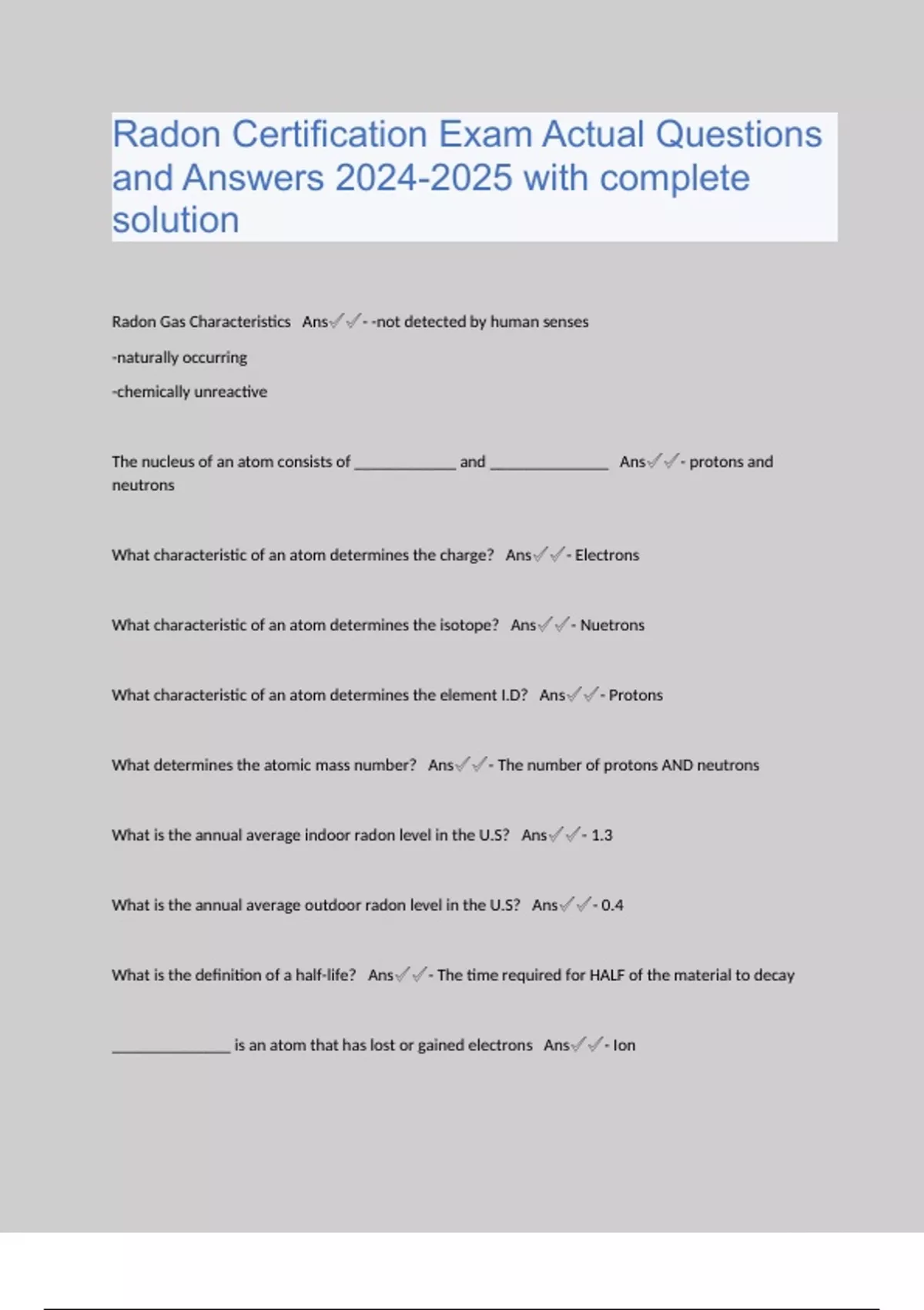 Radon Certification Exam Actual Questions and Answers with complete solution