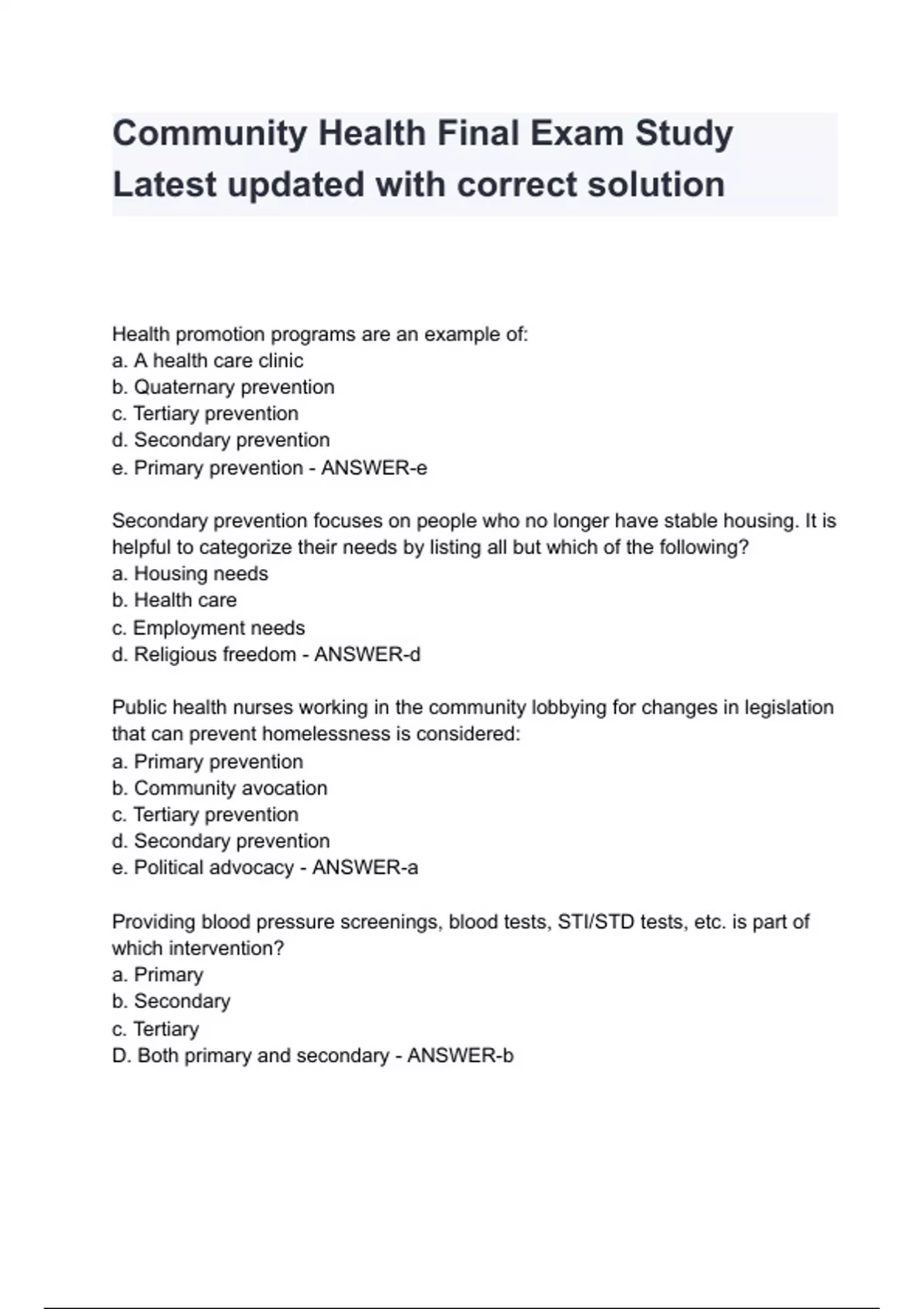Health promotion programs are an example of: a. A health care clinic b. Quaternary prevention c. Tertiary prevention d. Secondary prevention e. Primary prevention - ANSWER-e Secondary prevention focuses on people who no longer have stable housing. It is helpful to categorize their needs by listing all but which of the following? a. Housing needs b. Health care c. Employment needs d. Religious freedom - ANSWER-d Public health nurses working in the community lobbying for changes in legislation that can prevent homelessness is considered: a. Primary pre