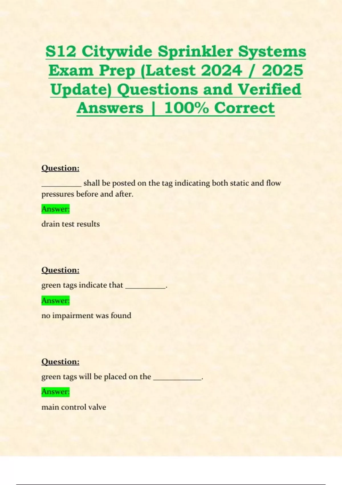 S12 Citywide Sprinkler Systems Exam Prep (Latest 2024 / 2025 Update) Questions and Verified Answers | 100% Correct Q: __________ shall be posted on the tag indicating both static and flow pressures before and after. Answer: drain test results Q: green tags indicate that __________. Answer: no impairment was found Q: green tags will be placed on the ____________. Answer: main control valve Q: systems partially or fully out of service shall have a ____________ tag placed on the main control valve. Answer: red Q: a _________ disc of 8-9 inches shall be placed on connections to indicate the system is fully out of service. Answer: white Q: a ________ disc of 8-9 inches shall be placed on connections to indicate the system is partially out of service. Answer: blue Q: the impairment coordinator will notify the ___________ carrier, central station and occupants. Answer: insurance Q: prior to returning a sys. To service, the ___________ shall ensure that necessary tests and inspections are conducted. Answer: impairment coordinator Q: glycerin not greater than _________ percent or glycol not greather than ________ percent shall be used to protect from freezing. Answer: 50, 40 Q: the cof number and signature of cof holder shall be posted near the ____________. Answer: main control valve Q: __________ shall be readily available to any representative of the fire dept. These are to be maintained on site for 3 years. Answer: records Q: failure to make inspections may result in __________ of the cof and court proceedings. Answer: revocation Q: the cof holder may inspect, test, and perform routine mx if they hold the following certs: Answer: refrigeration operating engineer, high pressure operating engineer, and nys high pressure operating engineer. Q: a ________ can inspect, maintain, test, and repair all fire standpipe and sprinkler systems. Answer: master fire suppression piping contractor (mfspc) Q: a master plumber (mp) with cof is limited to residential occupancies with _________ sprinkler heads or less. Answer: 30