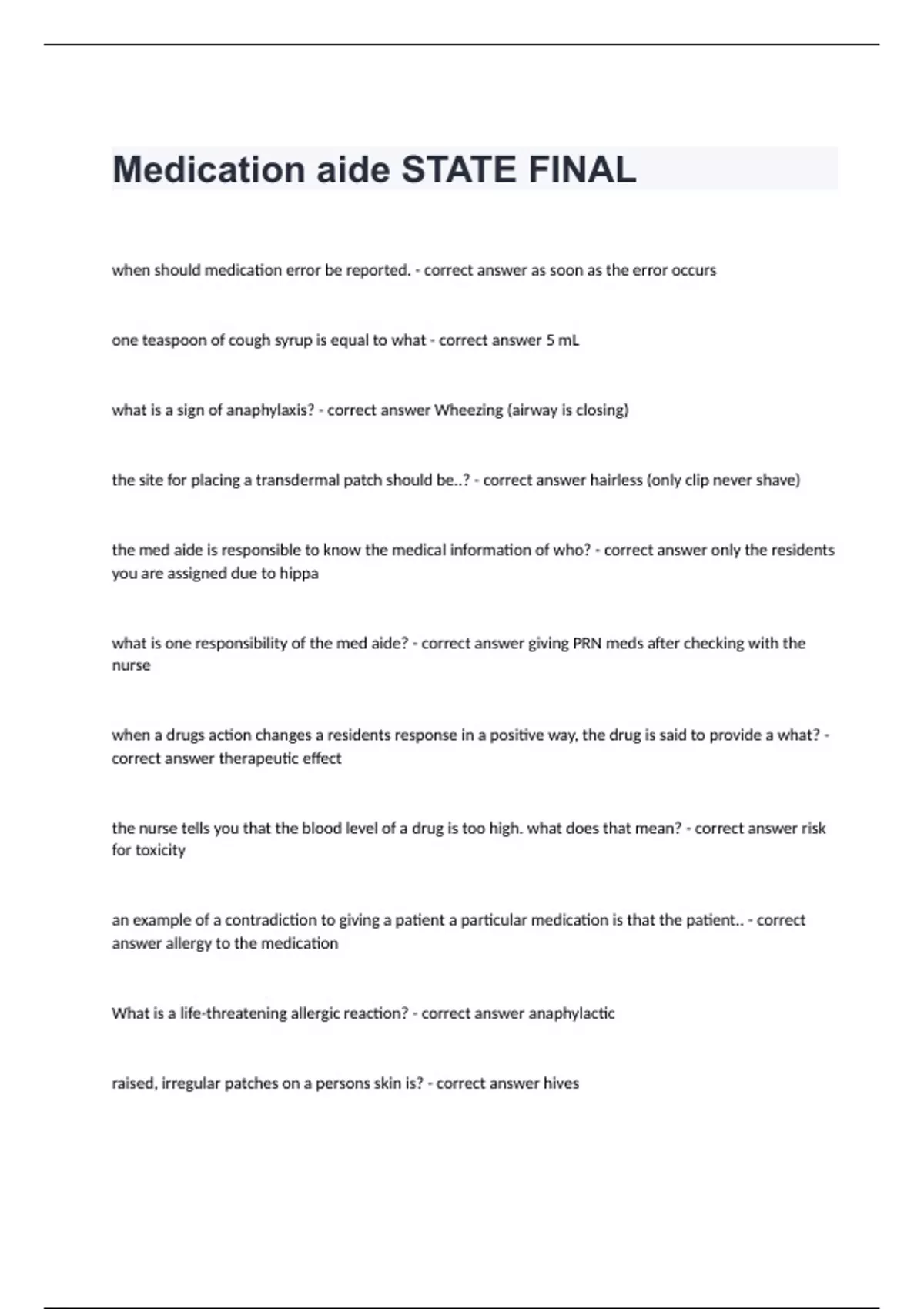 Medication aide STATE FINALwhen should medication error be reported. - correct answer as soon as the error occurs one teaspoon of cough syrup is equal to what - correct answer 5 mL what is a sign of anaphylaxis? - correct answer Wheezing (airway is closing) the site for placing a transdermal patch should be..? - correct answer hairless (only clip never shave) the med aide is responsible to know the medical information of who? - correct answer only the residents you are assigned due to hippa what is one responsibility of the med aide? - correct answer giving PRN meds after checking with the nurse when a drugs action changes a residents response in a positive way, the drug is said to provide a what? - correct answer therapeutic effect the nurse tells you that the blood level of a drug is too high. what does that mean? - correct answer risk for toxicity an example of a contradiction to giving a patient a particular medication is that the patient.. - correct answer allergy to the medication What is a life-threatening allergic reaction? - correct answer anaphylactic raised, irregular patches on a persons skin is? - correct answer hives