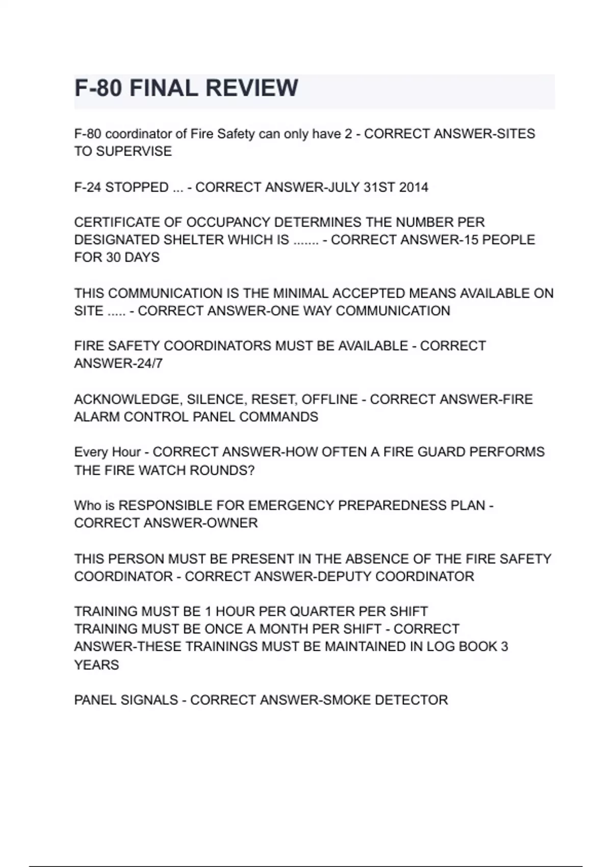 F-80 coordinator of Fire Safety can only have 2 - CORRECT ANSWER-SITES TO SUPERVISE F-24 STOPPED ... - CORRECT ANSWER-JULY 31ST 2014 CERTIFICATE OF OCCUPANCY DETERMINES THE NUMBER PER DESIGNATED SHELTER WHICH IS ....... - CORRECT ANSWER-15 PEOPLE FOR 30 DAYS THIS COMMUNICATION IS THE MINIMAL ACCEPTED MEANS AVAILABLE ON SITE ..... - CORRECT ANSWER-ONE WAY COMMUNICATION FIRE SAFETY COORDINATORS MUST BE AVAILABLE - CORRECT ANSWER-24/7 ACKNOWLEDGE, SILENCE, RESET, OFFLINE - CORRECT ANSWER-FIRE ALARM CONTROL PANEL COMMANDS Every Hour - CORRECT ANSWER-HOW OFTEN A FIRE GUARD PERFORMS THE FIRE WATCH ROUNDS? Who is RES