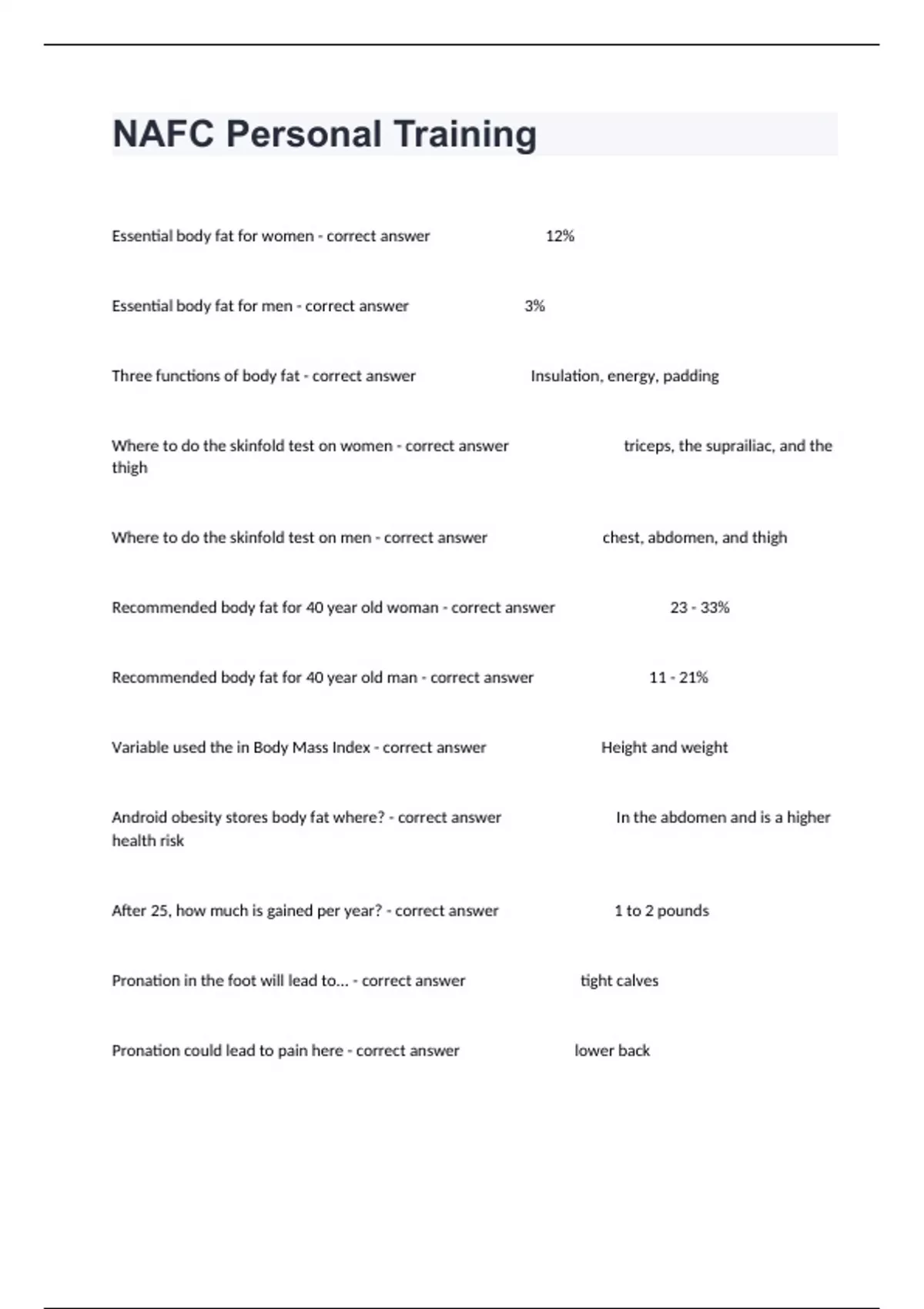 Essential body fat for women - correct answer 12% Essential body fat for men - correct answer 3% Three functions of body fat - correct answer Insulation, energy, padding Where to do the skinfold test on women - correct answer triceps, the suprailiac, and the thigh Where to do the skinfold test on men - correct answer chest, abdomen, and thigh Recommended body fat for 40 year old woman - correct answer 23 - 33% Recommended body fat for 40 year old man - correct answer 11 - 21% Variable used the in Body Mass Index - correct answer Height and weight Android obesity stores body fat where? - correct answer In the abdomen and is a higher health risk After 25, how much is gained per year? - correct answer 1 to 2 pounds Pronation in the foot will lead to... - correct answer tight calves Pronation could lead to pain here - correct answer lower back Excessive bend in knees is often caused by ... - correct answer tight hamstrings Lower cross syndrome can lead to ... - correct answer low back pain Result of Hyperlordosis - correct answer Weak abs and hamstrings Upper Cross Syndrome is composed of... - correct answer kyphosis, shoulder internal rotation, shoulder protraction, and anterior head carriage Calories burned with everyday activities - correct answer 1.5 calories per minute at rest How does the body use adenosine triphosphate (ATP), which comes from oxygen in blood? - correct answer Triphosphate comes from calories and fat which the body needs to produce energy while in motion What is Oxygen uptake? - correct answer the amount of oxygen that the body is conditioned to deliver throughout its system Anerobic Exercise - correct answer more intensive and the body can only sustain movement for a very short period of time. Some examples of anaerobic exercises are track competitions (for instance 100-400 meter sprints), swimming short distances, gymnastics performances, heavy weight lifting Aerobic Exercise - correct answer requires a large amount of oxygen to help the body maintain How does aerobic activity affect the blood? - correct answer it increases the ability to distribute oxygen through our hemoglobin, due to a higher number of red blood cells for oxygen transportation Heart rate with lots of aerobic exercise - correct answer Pumps slower, higher stroke volume Average heart rate - correct answer 70 to 80 beats per minute at rest The stronger the heart, the higher the... - correct answer stroke volume What test should the unconditioned client take for VO2 Max? - correct answer 1 mile walk test Older client should get doctor clearance to do this test for VO2 Max. - correct answer 1.5 mile run Who should do the bicycle test for VO2 Max? - correct answer overweight or may have issues with joints and muscle pain Swim Test for VO2 Max.. - correct answer 12 minutes of swimming... last resort test What does FITT mean - correct answer Frequency, Intensity, Type and Time duration Intensity of exercise for best results should be... - correct answer between 40% and 85% of their heart rate reserve to get the greatest results High intensity workout should be at what percent? - correct answer between 60% and 85% of their heart rate reserve to get the greatest results Best exercise duration - correct answer 20-60 minutes on a regular basis best recommendations for an effective cool down - correct answer walk or to jog for five minutes immediately after finishing an exercise session; then follow up with stretches and light calisthenic Short workout strategy - correct answer increase the intensity of the workout and decrease the duration