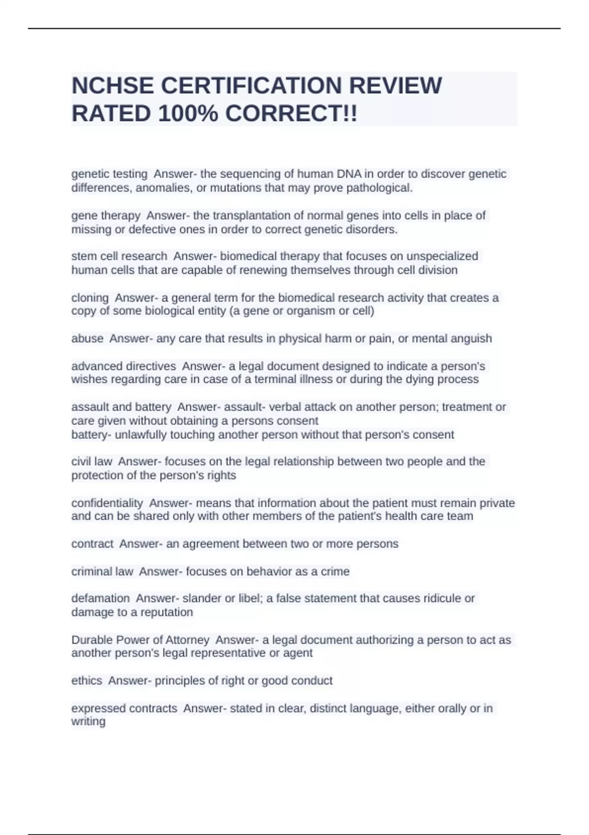 National Consortium for Health Science Education (NCHSE) CERTIFICATION EXAM REVIEW RATED 100% CORRECT genetic testing Answer- the sequencing of human DNA in order to discover genetic differences, anomalies, or mutations that may prove pathological. gene therapy Answer- the transplantation of normal genes into cells in place of missing or defective ones in order to correct genetic disorders. stem cell research Answer- biomedical therapy that focuses on unspecialized human cells that are capable of renewing themselves through cell division cloning Answer- a general term for the biomedical research activity that creates a copy of some biological entity (a gene or organism or cell) abuse Answer- any care that results in physical harm or pain, or mental anguish advanced directives Answer- a legal document designed to indicate a person's wishes regarding care in case of a terminal illness or during the dying process assault and battery Answer- assault- verbal attack on another person; treatment or care given without obtaining a persons consent battery- unlawfully touching another person without that person's consent civil law Answer- focuses on the legal relationship between two people and the protection of the person's rights confidentiality Answer- means that information about the patient must remain private and can be shared only with other members of the patient's health care team contract Answer- an agreement between two or more persons criminal law Answer- focuses on behavior as a crime defamation Answer- slander or libel; a false statement that causes ridicule or damage to a reputation Durable Power of Attorney Answer- a legal document authorizing a person to act as another person's legal representative or agent ethics Answer- principles of right or good conduct expressed contracts Answer- stated in clear, distinct language, either orally or in writing