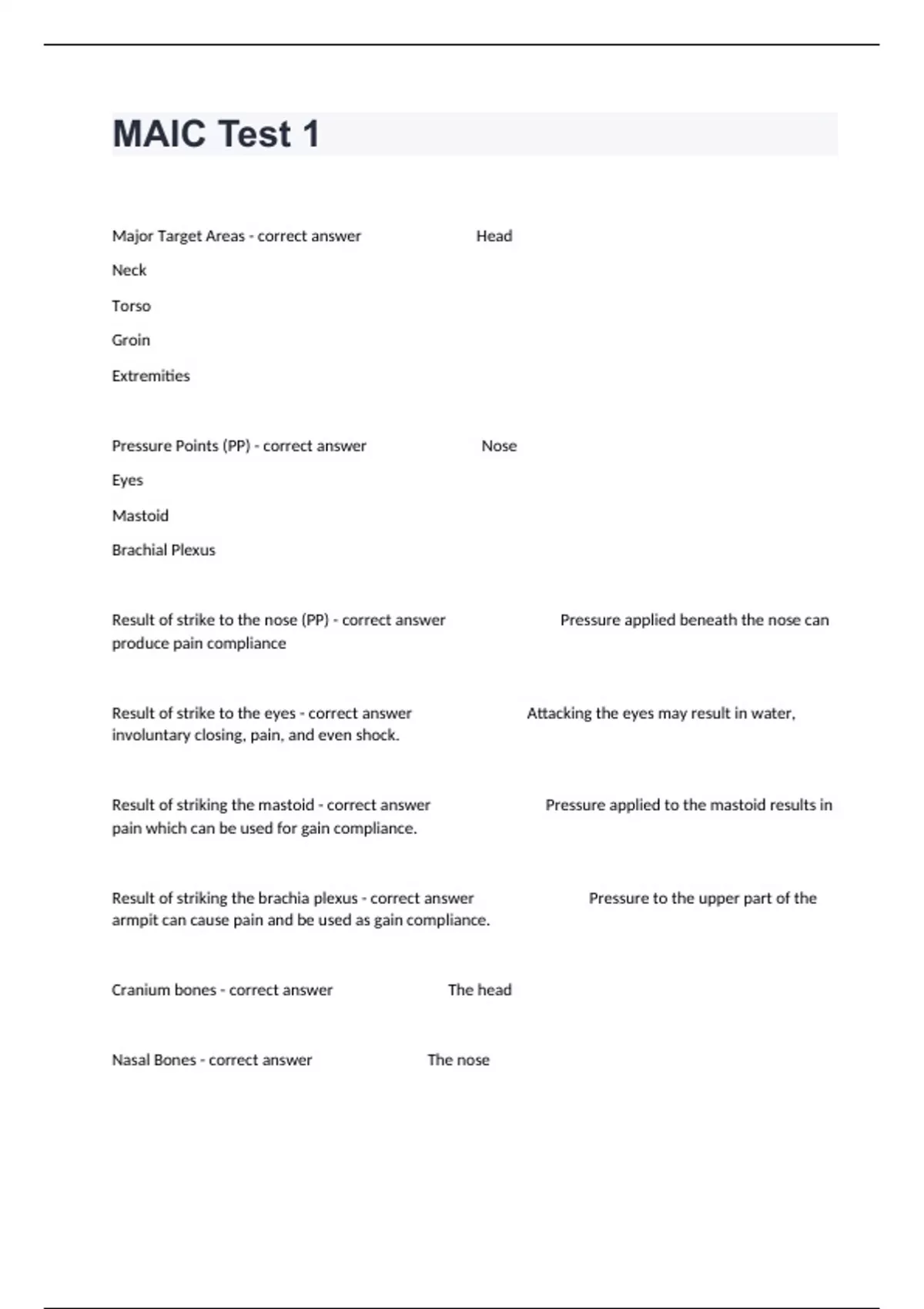 Major Target Areas - correct answer Head Neck Torso Groin Extremities Pressure Points (PP) - correct answer Nose Eyes Mastoid Brachial Plexus Result of strike to the nose (PP) - correct answer Pressure applied beneath the nose can produce pain compliance Result of strike to the eyes - correct answer Attacking the eyes may result in water, involuntary closing, pain, and even shock. Result of striking the mastoid - correct answer Pressure applied to the mastoid results in pain which can be used for gain compliance. Result of striking the brachia plexus - correct answer Pressure to the upper part of the armpit can cause pain and be used as gain compliance. Cranium bones - correct answer The head Nasal Bones - correct answer The nose Mandible - correct answer The jaw C1-C7 Cervical Vertebrates - correct answer Back of neck 33 Vertebrates, 5 Regions: Cervical, Thoracic, Lumbar, Sacral, Coccyx - correct answer Spinal Cord 12 pairs of ribs that house major internal organs - correct answer The thorax The coccyx - correct answer The tail bone Upper Arm Bone - correct answer Humerus Thumb Side Bone - correct answer Radius Pink Side Bone - correct answer Ulna Collarbone - correct answer Clavicle Thigh Bone - correct answer Femur Shinbone - correct answer Tibia & Fibula Importance of rehearsal - correct answer Reveals most effective wording Enhances instructor's knowledge of the subject matter Ensure a smooth flow of the presentation Increase chances of success Gear for Instructional Environment - correct answer Classroom (Setting) Media/Equipment Support Personnel Student Materials Communication Techniques - correct answer Verbal Nonverbal Listening Questioning Intro to EDIP - correct answer Attention Gainer Overview Positions (Demonstrate & Practice) Safeties Safeties - correct answer Safeties must be briefed before the Demonstration portion. All safeties for every technique can be found in the belt color books. E.D.I.P - correct answer Explain Demonstrate Imitate Practice A guided discussion using the citation for valor of a Marine who best exemplifies the warrior spirit. - correct answer Warrior Study Short guided discussion designed to develop the mental and character discipline of a Marine. - correct answer Tie-in Purpose of Free Sparring - correct answer 1. Bridge from static to dynamic 2. Inoculation to interpersonal violence Free Sparring events for Tan Belt - correct answer Pugil sticks Body Sparring *16 oz Gloves Free Sparring Event for Grey Belt - correct answer Ground Fighting Free Sparring Event for Green Belt - correct answer Standing Striking Free Sparring Event for Brown Belt - correct answer Standing to Ground *4 oz Gloves Free Sparring Event for Black Belt - correct answer Integrated Skills Free Sparring Time Limits in sparring Entry Level & All others - correct answer Entry level: 2-3 mins All Others: 3-6 mins Pugil Sticks Gear - correct answer Helmet w/ face mask Mouthpiece Neck Roll