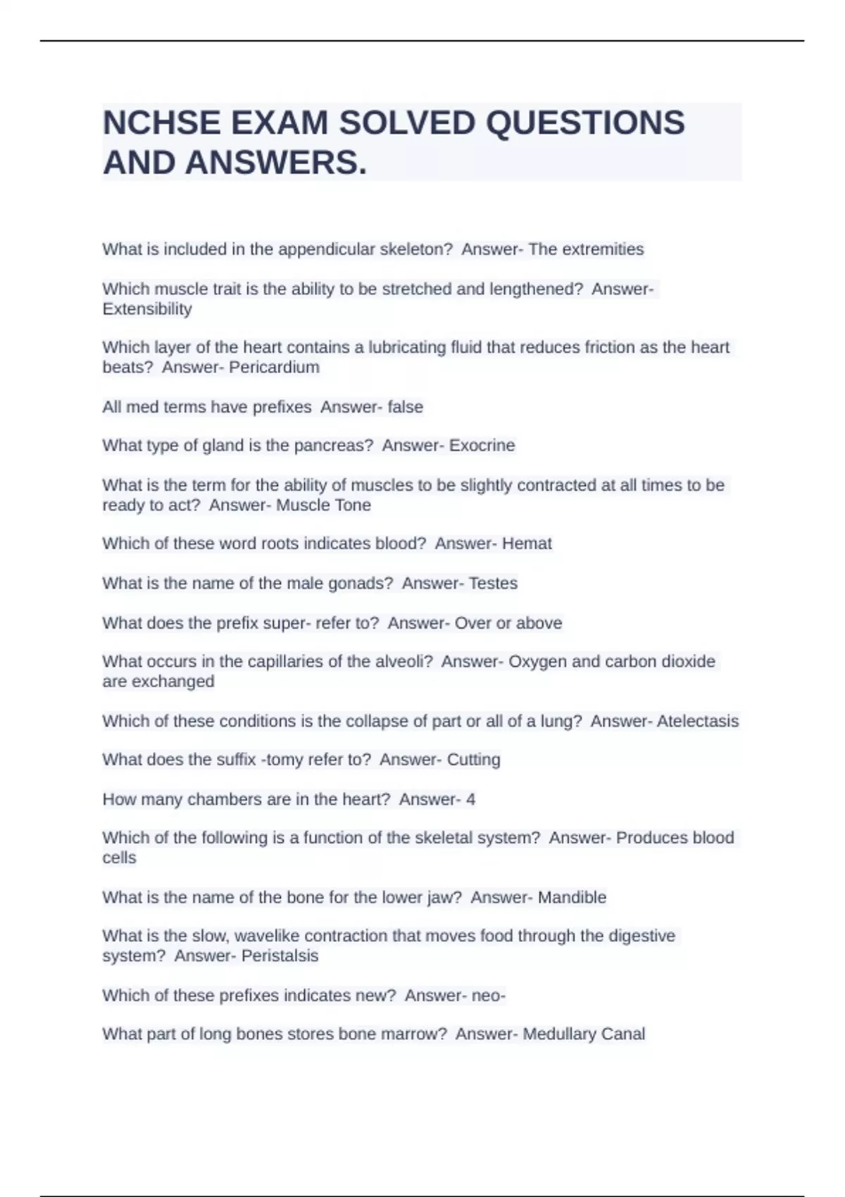 National Consortium for Health Science Education NCHSE EXAM SOLVED QUESTIONS AND ANSWERS What is included in the appendicular skeleton? Answer- The extremities Which muscle trait is the ability to be stretched and lengthened? Answer- Extensibility Which layer of the heart contains a lubricating fluid that reduces friction as the heart beats? Answer- Pericardium All med terms have prefixes Answer- false What type of gland is the pancreas? Answer- Exocrine What is the term for the ability of muscles to be slightly contracted at all times to be ready to act? Answer- Muscle Tone Which of these word roots indicates blood? Answer- Hemat What is the name of the male gonads? Answer- Testes What does the prefix super- refer to? Answer- Over or above What occurs in the capillaries of the alveoli? Answer- Oxygen and carbon dioxide are exchanged Which of these conditions is the collapse of part or all of a lung? Answer- Atelectasis What does the suffix -tomy refer to? Answer- Cutting How many chambers are in the heart? Answer- 4 Which of the following is a function of the skeletal system? Answer- Produces blood cells What is the name of the bone for the lower jaw? Answer- Mandible What is the slow, wavelike contraction that moves food through the digestive system? Answer- Peristalsis Which of these prefixes indicates new? Answer- neo- What part of long bones stores bone marrow? Answer- Medullary Canal