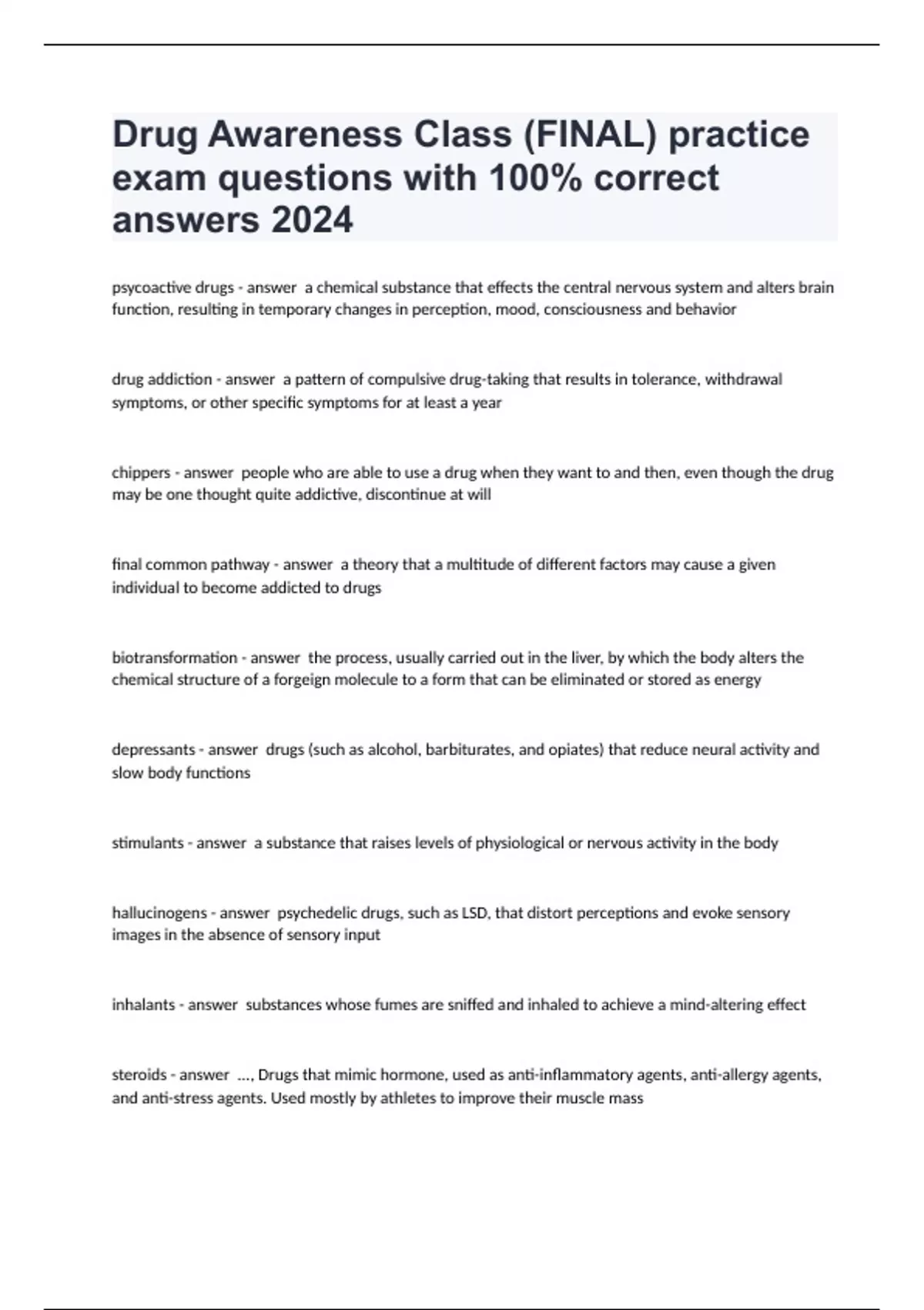 Drug Awareness Class (FINAL) practice exam questions with 100% correct answers 2024