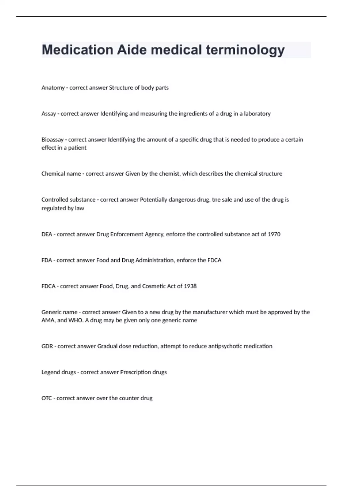 Medication Aide medical terminologyAnatomy - correct answer Structure of body parts Assay - correct answer Identifying and measuring the ingredients of a drug in a laboratory Bioassay - correct answer Identifying the amount of a specific drug that is needed to produce a certain effect in a patient Chemical name - correct answer Given by the chemist, which describes the chemical structure Controlled substance - correct answer Potentially dangerous drug, tne sale and use of the drug is regulated by law DEA - correct answer Drug Enforcement Agency, enforce the controlled substance act of 1970 FDA - correct answer Food and Drug Administration, enforce the FDCA FDCA - correct answer Food, Drug, and Cosmetic Act of 1938 Generic name - correct answer Given to a new drug by the manufacturer which must be approved by the AMA, and WHO. A drug may be given only one generic name GDR - correct answer Gradual dose reduction, attempt to reduce antipsychotic medication Legend drugs - correct answer Prescription drugs OTC - correct answer over the counter drug