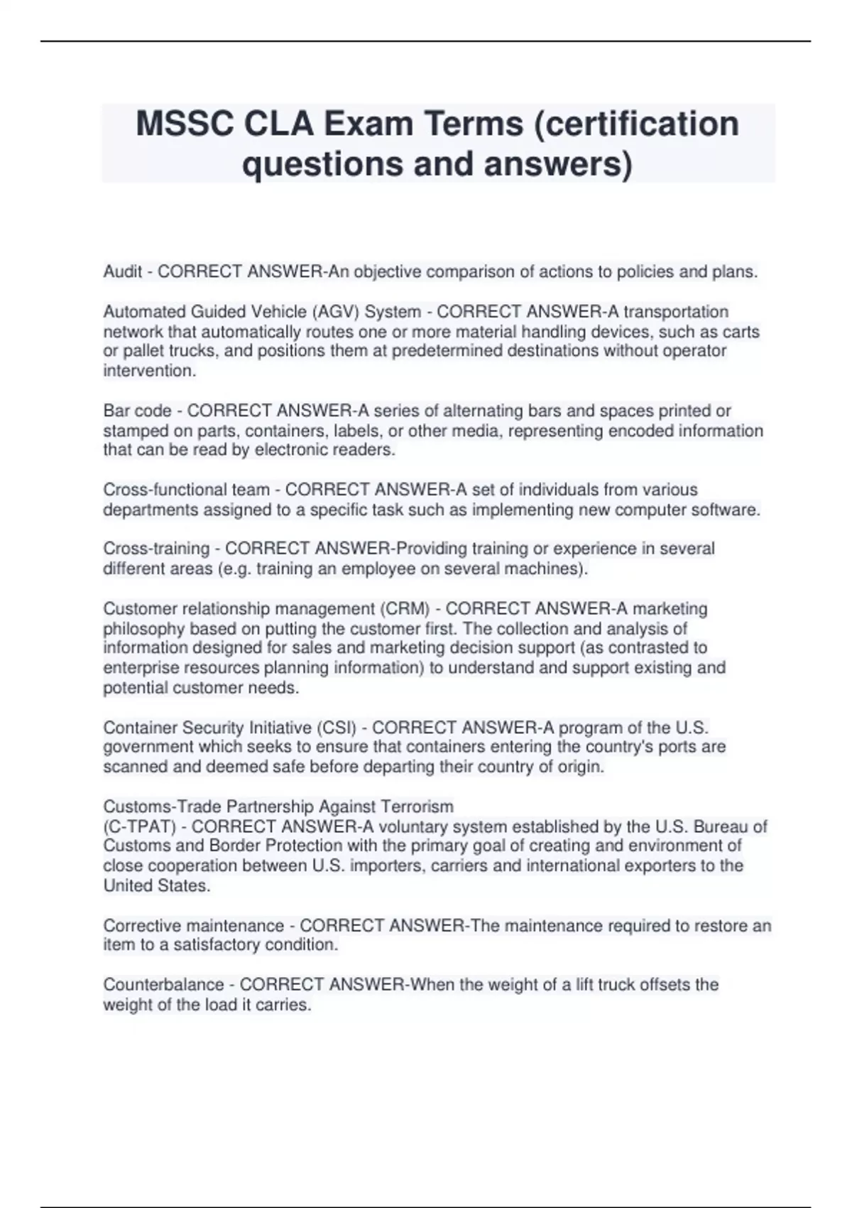 MSSC CLA Exam Terms (certification questions and answers) Audit - CORRECT ANSWER-An objective comparison of actions to policies and plans. Automated Guided Vehicle (AGV) System - CORRECT ANSWER-A transportation network that automatically routes one or more material handling devices, such as carts or pallet trucks, and positions them at predetermined destinations without operator intervention. Bar code - CORRECT ANSWER-A series of alternating bars and spaces printed or stamped on parts, containers, labels, or other media, representing encoded information that can be read by electronic readers. Cross-functional team - CORRECT ANSWER-A set of individuals from various departments assigned to a specific task such as implementing new computer software. Cross-training - CORRECT ANSWER-Providing training or experience in several different areas (e.g. training an employee on several machines). Customer relationship management (CRM) - CORRECT ANSWER-A marketing philosophy based on putting the customer first. The collection and analysis of information designed for sales and marketing decision support (as contrasted to enterprise resources planning information) to understand and support existing and potential customer needs. Container Security Initiative (CSI) - CORRECT ANSWER-A program of the U.S. government which seeks to ensure that containers entering the country's ports are scanned and deemed safe before departing their country of origin. Customs-Trade Partnership Against Terrorism (C-TPAT) - CORRECT ANSWER-A voluntary system established by the U.S. Bureau of Customs and Border Protection with the primary goal of creating and environment of close cooperation between U.S. importers, carriers and international exporters to the United States. Corrective maintenance - CORRECT ANSWER-The maintenance required to restore an item to a satisfactory condition. Counterbalance - CORRECT ANSWER-When the weight of a lift truck offsets the weight of the load it carries