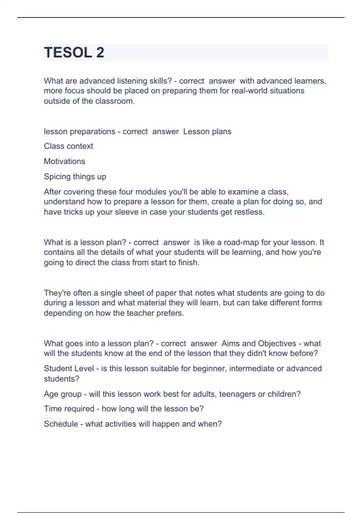 TESOL Question and answers 100% correct 2024 What are advanced listening skills? - correct answer with advanced learners, more focus should be placed on preparing them for real-world situations outside of the classroom. lesson preparations - correct answer Lesson plans Class context Motivations Spicing things up After covering these four modules you'll be able to examine a class, understand how to prepare a lesson for them, create a plan for doing so, and have tricks up your sleeve in case your students get restless. What is a lesson plan? - correct answer is like a road-map for your lesson. It contains all the details of what your students will be learning, and how you're going to direct the class from start to finish. They're often a single sheet of paper that notes what students are going to do during a lesson and what material they will learn, but can take different forms depending on how the teacher prefers. What goes into a lesson plan? - correct answer Aims and Objectives - what will the students know at the end of the lesson that they didn't know before? Student Level - is this lesson suitable for beginner, intermediate or advanced students? Age group - will this lesson work best for adults, teenagers or children? Time required - how long will the lesson be? Schedule - what activities will happen and when? Homework - will there be any homework? A resource list - what resources will you need to prepare? Teaching Methodologies - correct answer Presenting new information to students and having them store it to memory within an hour-long lesson can be quite a challenge. To help you deliver this information effectively, there are a number of approaches which have been developed over the years. The lesson plan in the example above uses a common approach known as PPP (Presentation, Practice, Production) which first introduces new language and then gives stud