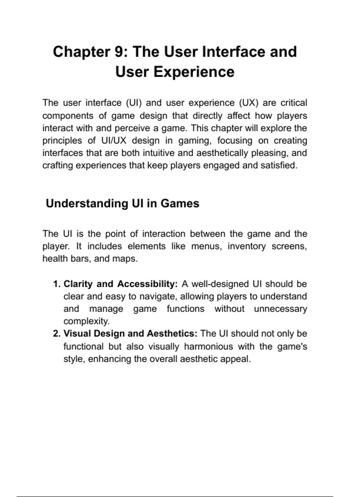 Description: Designing intuitive interfaces and engaging player experiences. Keywords: UI, UX, interface design, player experience Questions: What is important in UI/UX design for games?, How do you create an intuitive interface?