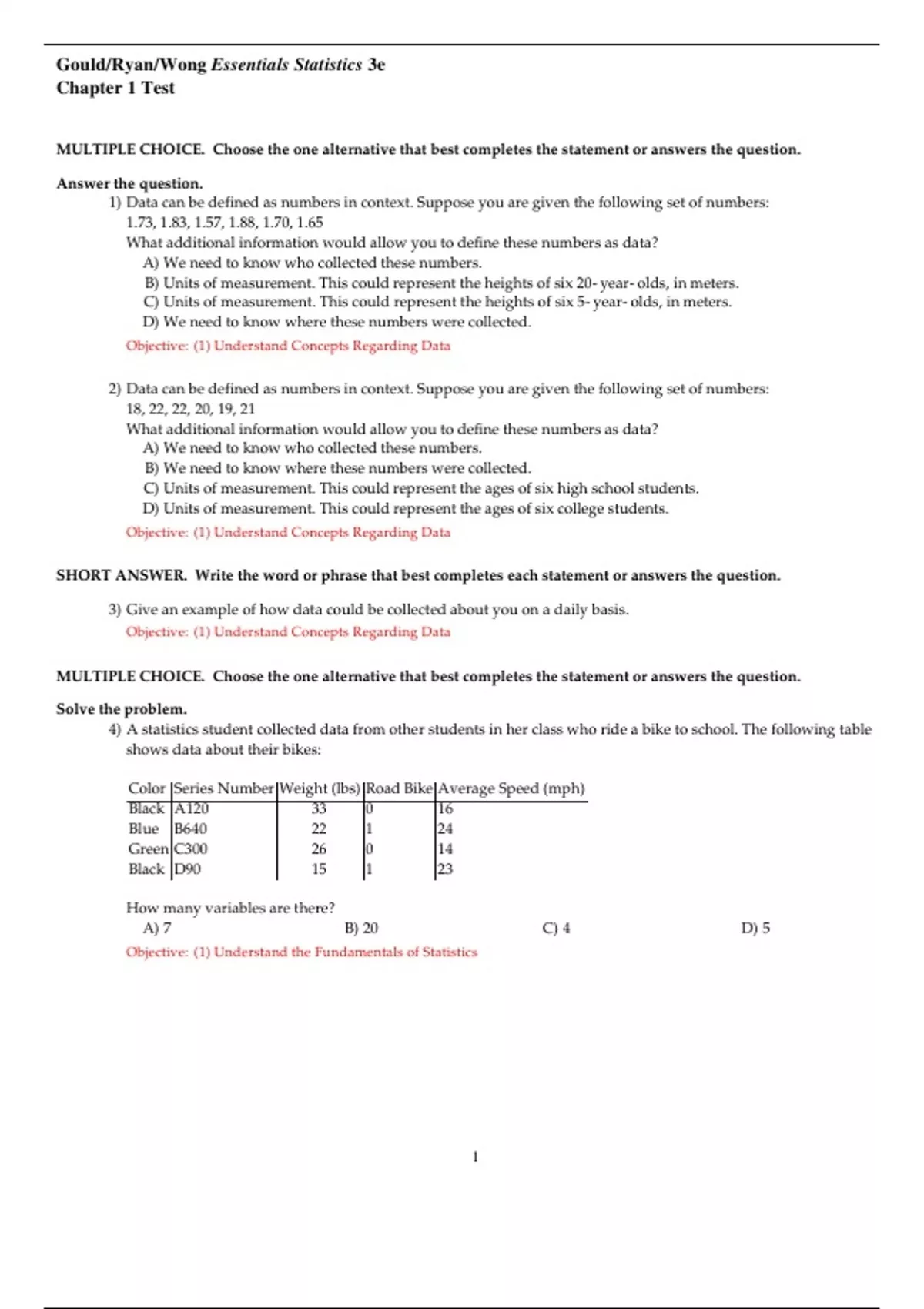 Test Bank For Essential Statistics Exploring the world through data 3th Edition by Robert N. Gould, Rebecca Wong, Colleen Ryan