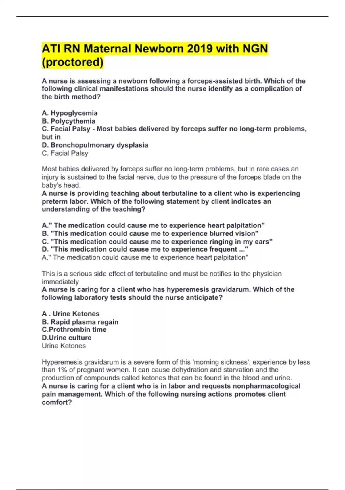 ATI RN Maternal Newborn 2019 with NGN (proctored) A nurse is assessing a newborn following a forceps-assisted birth. Which of the following clinical manifestations should the nurse identify as a complication of the birth method? A. Hypoglycemia B. Polycythemia C. Facial Palsy - Most babies delivered by forceps suffer no long-term problems, but in D. Bronchopulmonary dysplasia C. Facial Palsy Most babies delivered by forceps suffer no long-term problems, but in rare cases an injury is sustained to the facial nerve, due to the pressure of the forceps blade on the baby's head. A nurse is providing teaching about terbutaline to a client who is experiencing preterm labor. Which of the following statement by client indicates an understanding of the teaching? A." The medication could cause me to experience heart palpitation" B. "This medication could cause me to experience blurred vision" C. "This medication could cause me to experience ringing in my ears" D. "This medication could cause me to experience frequent ..." A." The medication could cause me to experience heart palpitation" This is a serious side effect of terbutaline and must be notifies to the physician immediately A nurse is caring for a client who has hyperemesis gravidarum. Which of the following laboratory tests should the nurse anticipate? A . Urine Ketones B. Rapid plasma regain C.Prothrombin time D.Urine culture Urine Ketones Hyperemesis gravidarum is a severe form of this 'morning sickness', experience by less than 1% of pregnant women. It can cause dehydration and starvation and the production of compounds called ketones that can be found in the blood and urine. A nurse is caring for a client who is in labor and requests nonpharmacological pain management. Which of the following nursing actions promotes client comfort? A. Assisting the client into squatting position B. Having the client lie in a supine position C. Applying fundal pressure during contractions D. Encouraging the client to void every 6 hr Having the client lie in a supine position Having the patient lie in a comfortable position may help reduce sensation of pain due to labor A nurse caring for a client who is at 20 weeks of gestation and has trichomoniasis. Which of the following findings should the nurse expect? A. Thick, White Vaginal Discharge B. Urinary Frequency C. Vulva Lesions D. Malodorous Discharge Malodorous Discharge A nurse is caring for a client who is 14 weeks of gestation. At which the following locations should the nurse place the Doppler device when assessing the fetal heart rate? A . Midline 2 to 3 cm (0.8 to 1.2 in) above the symphysis pubis B. Left Upper Abdomen C. Two fingerbreadths above the umbilicus D. Lateral at the Xiphoid Process Midline 2 to 3 cm (0.8 to 1.2 in) above the symphysis pubis at 14 weeks AOG this is where to place the doppler probe to note FHT A nurse is assessing a client who is at 27 weeks of gestation and has preeclampsia. Which of the following findings should the nurse report to the provider? A. Urine protein concentration 200 mg/ 24 hr B. Creatinine 0.8 mg/ dL C. Hemoglobin 14.8 g/ dL D. Platelet Count 60.000/ mm3 Platelet Count 60.000/ mm3 platelet count of less than 100,000 correlates with how severe the condition is. A nurse is teaching about clomiphene citrate to a client who is experiencing infertility. Which of the following adverse effect should the nurse include? A. Tinnitus B. Urinary Frequency C. Breast Tenderness D. Chills Tinnitus this is a documented adverse effect of this medication A nurse is assessing a newborn upon admission to the nursery. Which of the following should the nurse expect? A. Bulging Fontanels B. Nasal Flaring C. Length from head to heel of 40 cm (15.7 in) D. Chest circumference 2 cm (0.8 in) smaller than the head circumference Chest circumference 2 cm (0.8 in) smaller than the head circumference head circumference is always 2cm more than the chest in normal term babies A nurse is planning care for a newborn who has neonatal abstinence syndrome. Which of the following interventions should the nurse include in the plan of care? A. Increase the newborn's visual stimulation B. Weigh the newborn every other day C. Discourage parental interaction until after a social evaluation D. Swaddle the newborn in a flexed position Swaddle the newborn in a flexed position to increase comfort that newborn is receiving .A nurse is caring for a newborn who is 6 hr old and has a bedside glucometer reading of 65 mg/ dL. The newborn's mother has type 2 diabetes mellitus. Which of the following actions should the nurse take? A. Obtain a blood sample for a serum glucose level B. Feed the newborn immediately C. Administer 50 mL of dextrose solution IV D. Reassess the blood glucose level prior to the next feeding Reassess the blood glucose level prior to the next feeding newborn blood glucose is normal because it has separated from it's source of energy which is the mother. Blood glucose for newborn to be considered hypoglycemic is 45mg/dl and below. A nurse is providing teaching to a client about exercise safety during pregnancy. Which of the following statements by the client indicates an understanding of the teaching? (Select all that apply). A. "I will limit my time in the hot tub to 30 minutes after exercise." B. "I should consume three 8-ounce glasses of water after I exercise." C. "I will check my heart rate every 15 minutes during exercise sessions." D. "I should limit exercise sessions to 30 minutes when the weather is humid." E. "I should rest by lying on my side for 10 minutes following exercise." C. "I will check my heart rate every 15 minutes during exercise sessions." E. "I should rest by lying on my side for 10 minutes following exercise." A charge nurse is teaching a group of staff nurses about fetal monitoring during labor. Which of the following findings should the charge nurse instruct the staff members to report to the provider? A. Contraction durations of 95 to 100 seconds maybe this true