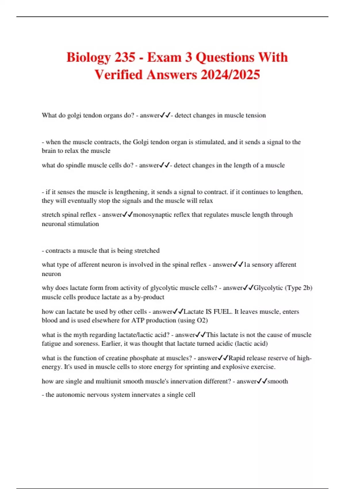 Biology 235 - Exam 3 Questions With Verified Answers 2024/2025 What do golgi tendon organs do? - answer- detect changes in muscle tension - when the muscle contracts, the Golgi tendon organ is stimulated, and it sends a signal to the brain to relax the muscle what do spindle muscle cells do? - answer- detect changes in the length of a muscle - if it senses the muscle is lengthening, it sends a signal to contract. if it continues to lengthen, they will eventually stop the signals and the muscle will relax stretch spinal reflex - answermonosynaptic reflex that regulates muscle length through neuronal stimulation - contracts a muscle that is being stretched what type of afferent neuron is involved in the spinal reflex - answer1a sensory afferent neuron why does lactate form from activity of glycolytic muscle cells? - answerGlycolytic (Type 2b) muscle cells produce lactate as a by-product how can lactate be used by other cells - answerLactate IS FUEL. It leaves muscle, enters blood and is used elsewhere for ATP production (using O2) what is the myth regarding lactate/lactic acid? - answerThis lactate is not the cause of muscle fatigue and soreness. Earlier, it was thought that lactate turned acidic (lactic acid) what is the function of creatine phosphate at muscles? - answerRapid release reserve of high- energy. It's used in muscle cells to store energy for sprinting and explosive exercise. how are single and multiunit smooth muscle's innervation different? - answersmooth - the autonomic nervous system innervates a single cell multiunit - densely innervated by autonomic nerve fibers how do gap junctions help single unit smooth muscles coordinate their contraction? - answersynchronizes membrane depolarization and contractions so the muscle contracts as a single unit can you give an example of single unit or multiunit smooth muscle? - answersingle unit - uterus, intestine, bladde multiunit - iris of the eye and arrector pili muscles in the skin which muscle type is more similar to how skeletal muscles are triggered to contract? - answermultiunit Artioventricular valves - answermitral (bicuspid) - located between the left atrium and ventricle tricuspid - valve between right atrium and ventricle aortic valve - answerThe semilunar valve separating the aorta from the left ventricle that prevents blood from flowing back into the left ventricle. pulmonary valve - answervalve positioned between the right ventricle and the pulmonary artery chordae tendineae - answerthin bands of fibrous tissue that attach to the valves in the heart and prevent them from inverting intercalated discs - answersupport synchronized contraction of cardiac tissue what junctions are at an intercalated disc? - answerThe junctions are Desmosomes (to keep cells from separating) and Gap junctions (allows APs to propagate). basic flow through the heart - answer- Atrial and Ventricular diastole fills the ventricles with blood - Sinoatrial (SA) node starts systole, starting the contraction of the atrium.