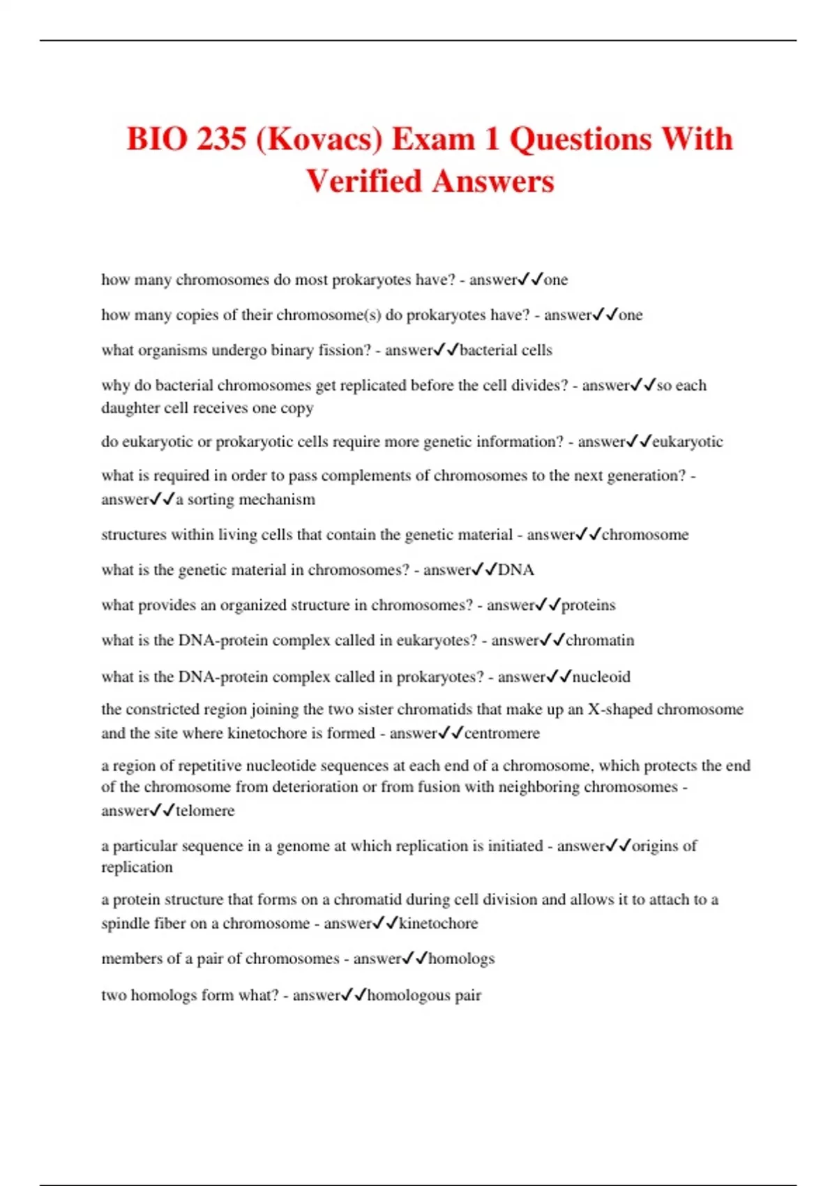 BIO 235 (Kovacs) Exam 1 Questions With Verified Answers how many chromosomes do most prokaryotes have? - answerone how many copies of their chromosome(s) do prokaryotes have? - answerone what organisms undergo binary fission? - answerbacterial cells why do bacterial chromosomes get replicated before the cell divides? - answerso each daughter cell receives one copy do eukaryotic or prokaryotic cells require more genetic information? - answereukaryotic what is required in order to pass complements of chromosomes to the next generation? - answera sorting mechanism structures within living cells that contain the genetic material - answerchromosome what is the genetic material in chromosomes? - answerDNA what provides an organized structure in chromosomes? - answerproteins what is the DNA-protein complex called in eukaryotes? - answerchromatin what is the DNA-protein complex called in prokaryotes? - answernucleoid the constricted region joining the two sister chromatids that make up an X-shaped chromosome and the site where kinetochore is formed - answercentromere a region of repetitive nucleotide sequences at each end of a chromosome, which protects the end of the chromosome from deterioration or from fusion with neighboring chromosomes - answertelomere a particular sequence in a genome at which replication is initiated - answerorigins of replication a protein structure that forms on a chromatid during cell division and allows it to attach to a spindle fiber on a chromosome - answerkinetochore members of a pair of chromosomes - answerhomologs two homologs form what? - answerhomologous pair what are the similarities between two chromosomes in a homologous pair? - answerthey are nearly identical in size, have the same banding pattern and centromere location, and they have the same genes but not necessarily the same alleles how many sets of chromosomes do diploid cells have? - answertwo how many sets of chromosomes do haploid cells have? - answerone an organized representation of the metaphase chromosomes within a diploid eukaryotic cell - answerkaryotype chromosomes that come in pairs (homologs) are called what? - answerautosomes are the sex chromosomes, X and Y, homologous and why? - answerno because they differ in size and genetic composition, but they do have regions of homology why do eukaryotic cells undergo mitosis? - answerto ensure that the daughter cells receive one complete set of chromosomes (one copy of each chromosome) what is the repeating pattern of cell growth followed by cell division called? - answercell cycle what are the phases G1, S, and G2 collectively called? - answerinterphase during what phase in interphase does the cell grow in volume? - answerG1 what is the name of the phase a cell is in when progression through the cell cycle is postponed or when a cell decides to never divide again? (ex: nerve cells) - answerG0 what are the cells called who decide to never divide again? - answerterminally differentiated cells or post-mitotic cells during what phase in interphase are the chromosomes replicated? - answerS two copies of a replicated chromosome - answerchromatids two copies of a replicated chromosome joined at the centromere - answersister chromatids during what phase in interphase does the cell accumulate the materials and molecular machinery that are necessary for nuclear and cellular division? - answerG2 what is the difference between a kinetochore and a centromere? - answerkinetochore are the proteins attached to the centromere and the centromere is the DNA that is hidden beneath the kinetochore proteins during what phase are the chromosomes relaxed and unable to be seen individually under a microscope? - answerinterphase