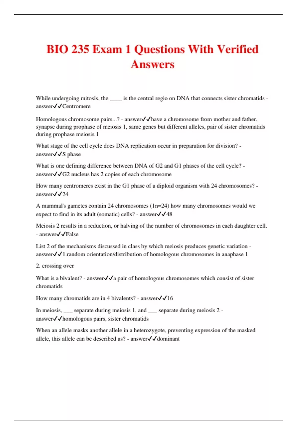 BIO 235 Exam 1 Questions With Verified Answers While undergoing mitosis, the ____ is the central regio on DNA that connects sister chromatids - answerCentromere Homologous chromosome pairs...? - answerhave a chromosome from mother and father, synapse during prophase of meiosis 1, same genes but different alleles, pair of sister chromatids during prophase meiosis 1 What stage of the cell cycle does DNA replication occur in preparation for division? - answerS phase What is one defining difference between DNA of G2 and G1 phases of the cell cycle? - answerG2 nucleus has 2 copies of each chromosome How many centromeres exist in the G1 phase of a diploid organism with 24 chromosomes? - answer24 A mammal's gametes contain 24 chromosomes (1n=24) how many chromosomes would we expect to find in its adult (somatic) cells? - answer48 Meiosis 2 results in a reduction, or halving of the number of chromosomes in each daughter cell. - answerFalse List 2 of the mechanisms discussed in class by which meiosis produces genetic variation - answerm orientation/distribution of homologous chromosomes in anaphase 1 2. crossing over What is a bivalent? - answera pair of homologous chromosomes which consist of sister chromatids How many chromatids are in 4 bivalents? - answer16 In meiosis, ___ separate during meiosis 1, and ___ separate during meiosis 2 - answerhomologous pairs, sister chromatids When an allele masks another allele in a heterozygote, preventing expression of the masked allele, this allele can be described as? - answerdominant