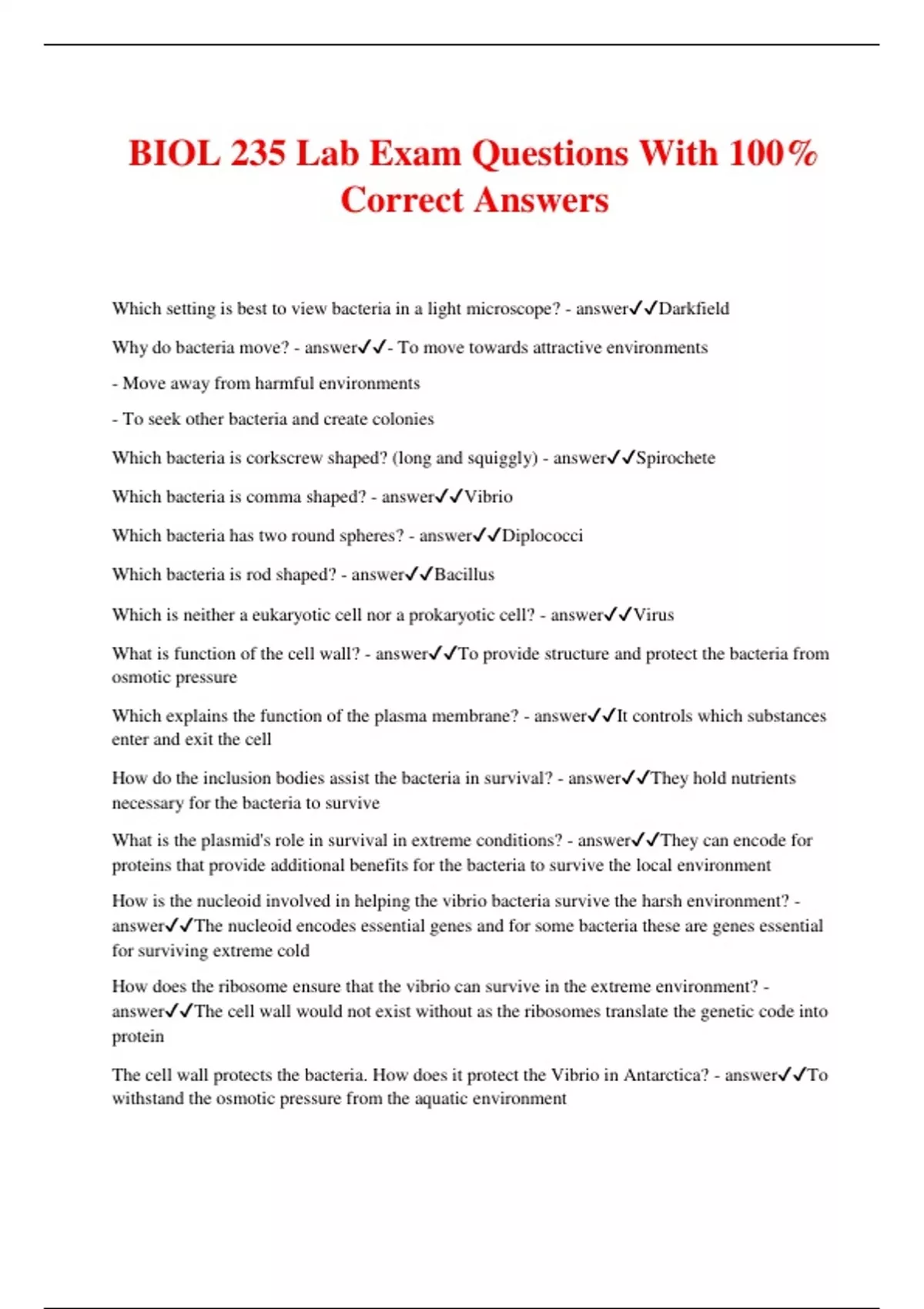 BIOL 235 Lab Exam Questions With 100% Correct Answers Which setting is best to view bacteria in a light microscope? - answerDarkfield Why do bacteria move? - answer- To move towards attractive environments - Move away from harmful environments - To seek other bacteria and create colonies Which bacteria is corkscrew shaped? (long and squiggly) - answerSpirochete Which bacteria is comma shaped? - answerVibrio Which bacteria has two round spheres? - answerDiplococci Which bacteria is rod shaped? - answerBacillus Which is neither a eukaryotic cell nor a prokaryotic cell? - answerVirus What is function of the cell wall? - answerTo provide structure and protect the bacteria from osmotic pressure Which explains the function of the plasma membrane? - answerIt controls which substances enter and exit the cell How do the inclusion bodies assist the bacteria in survival? - answerThey hold nutrients necessary for the bacteria to survive What is the plasmid's role in survival in extreme conditions? - answerThey can encode for proteins that provide additional benefits for the bacteria to survive the local environment How is the nucleoid involved in helping the vibrio bacteria survive the harsh environment? - answerThe nucleoid encodes essential genes and for some bacteria these are genes essential for surviving extreme cold How does the ribosome ensure that the vibrio can survive in the extreme environment? - answerThe cell wall would not exist without as the ribosomes translate the genetic code into protein The cell wall protects the bacteria. How does it protect the Vibrio in Antarctica? - answerTo withstand the osmotic pressure from the aquatic environment