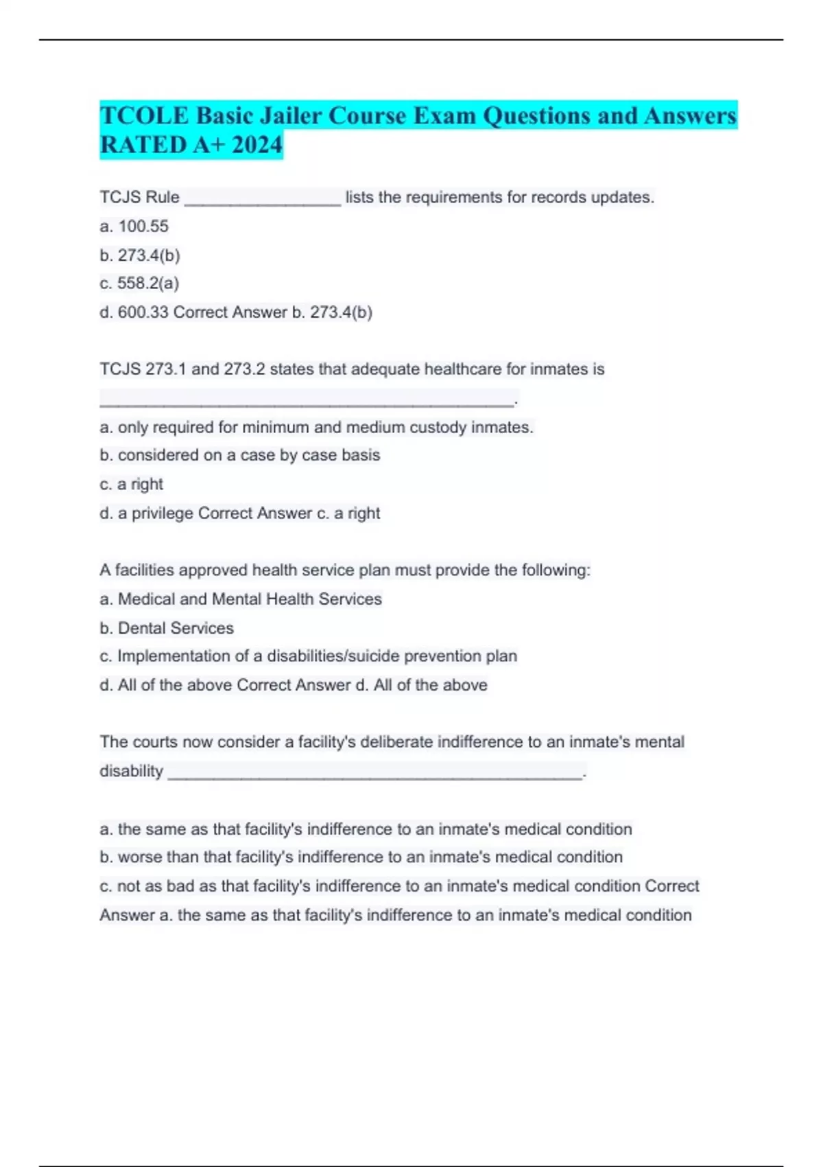 TCOLE Basic Jailer Course Exam Questions and Answers RATED A+ 2024 TCJS Rule _________________ lists the requirements for records updates. a. 100.55 b. 273.4(b) c. 558.2(a) d. 600.33 Correct Answer b. 273.4(b) TCJS 273.1 and 273.2 states that adequate healthcare for inmates is _____________________________________________. a. only required for minimum and medium custody inmates. b. considered on a case by case basis c. a right d. a privilege Correct Answer c. a right A facilities approved health service plan must provide the following: a. Medical and Mental Health Services b. Dental Services c. Implementation of a disabilities/suicide prevention plan d. All of the above Correct Answer d. All of the above The courts now consider a facility's deliberate indifference to an inmate's mental disability _____________________________________________. a. the same as that facility's indifference to an inmate's medical condition b. worse than that facility's indifference to an inmate's medical condition c. not as bad as that facility's indifference to an inmate's medical condition Correct Answer a. the same as that facility's indifference to an inmate's medical condition A correctional facility can eliminate eligible inmates from programs and services solely on the basis of a mental (or physical) disability. a. True b. False Correct Answer b. False Which section of the Health and Safety Code authorizes the Texas D