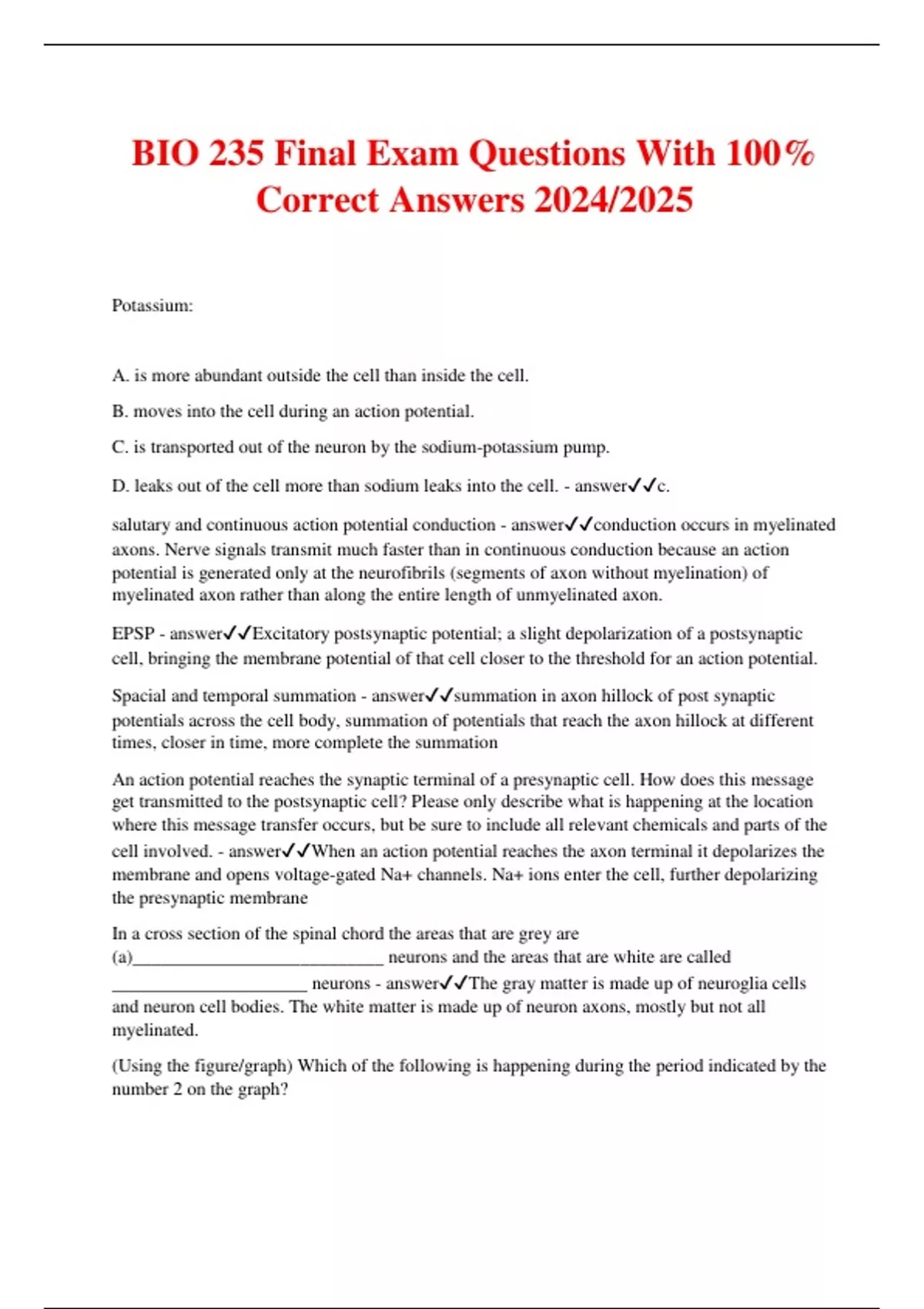 BIO 235 Final Exam Questions With 100% Correct Answers 2024/2025 Potassium: A. is more abundant outside the cell than inside the cell. B. moves into the cell during an action potential. C. is transported out of the neuron by the sodium-potassium pump. D. leaks out of the cell more than sodium leaks into the cell. - answerc. salutary and continuous action potential conduction - answerconduction occurs in myelinated axons. Nerve signals transmit much faster than in continuous conduction because an action potential is generated only at the neurofibrils (segments of axon without myelination) of myelinated axon rather than along the entire length of unmyelinated axon. EPSP - answerExcitatory postsynaptic potential; a slight depolarization of a postsynaptic cell, bringing the membrane potential of that cell closer to the threshold for an action potential. Spacial and temporal summation - answersummation in axon hillock of post synaptic potentials across the cell body, summation of potentials that reach the axon hillock at different times, closer in time, more complete the summation An action potential reaches the synaptic terminal of a presynaptic cell. How does this message get transmitted to the postsynaptic cell? Please only describe what is happening at the location where this message transfer occurs, but be sure to include all relevant chemicals and parts of the cell involved. - answerWhen an action potential reaches the axon terminal it depolarizes the membrane and opens voltage-gated Na+ channels. Na+ ions enter the cell, further depolarizing the presynaptic membrane In a cross section of the spinal chord the areas that are grey are (a)___________________________ neurons and the areas that are white are called _____________________ neurons - answerThe gray matter is made up of neuroglia cells and neuron cell bodies. The white matter is made up of neuron axons, mostly but not all myelinated. (Using the figure/graph) Which of the following is happening during the period indicated by the number 2 on the graph? A. There is no ion movement during this period. B. chloride is entering the neuron through chemically-gated channels. C. potassium is leaving the neuron through voltage-gated channels. D. sodium is entering the neuron through voltage-gated channels. - answersodium is entering the neuron through voltage-gated channels. A strong stimulus coming into a dendrite of a multipolar neuron will cause a strong graded potential to be generated. True False - answertrue Myelin Sheaths in the PNS: a. Increases speed of action potentials b. Protects and electrically insulates neurons from one another c. All of the answers are correct d. Concentric layers of Schwann cells membrane e. None of the answers are correct - answerAll of the above Where would you find sodium-potassium pumps and leak channels on a neuron? A. cell body only B. synaptic terminal only C. entire neuron cell membrane D. axon only E. dendrites only - answerA. cell body only An IPSP: A. is caused by a chemically-gated sodium channel opening. B. hyperpolarizes the post-synaptic cell pushing it farther from threshold. C. is a graded depolarization of the post-synaptic cell. D. is an excitatory stimulus bringing the neuron closer to an action potential. - answerB. hyperpolarizes the post-synaptic cell pushing it farther from threshold Are the first channels opened when -55mV is reached at the axon hillock. - answerVoltage- gated sodium channels Cause the transmembrane potential to maintain a relatively stable state of -70mV. - answer Cause a graded depolarization to occur on the cell body and dendrites. - answer Cause the transmembrane potential to go from +30mV to about -90 mV. - answer Cause synaptic vesicles to migrate to the cell membrane at the synaptic terminal. - answercalcium produce myelination in the peripheral nervous system (PNS) neurons. A. Schwann cells B. Satellite cells C. Astrocytes Ependymal cells D. Oligodendrocytes E. Microglia - answerSchwann Cells What causes chemically-gated channels to open? A. The binding of calcium ion to the channel. B. The binding of neurotransmitter to the channel. C. The binding of potassium ion to the channel. D. The binding of a sodium ion to the channel. - answerB. binding of a neurotransmitter Because all action potentials are alike, how does a neuron communicate to the next neuron if the original stimulus was intense or just a neusance? - answer Describe what is happening in the neuron during a graded potential. Please only describe what is happening at the location where the graded potential occurs, but be sure to include all relevant chemicals and parts of the cell involved - answeris produced when a ligand opens a ligand- gated channel in the dendrites, allowing ions to enter (or exit) the cell. The graded potential will
