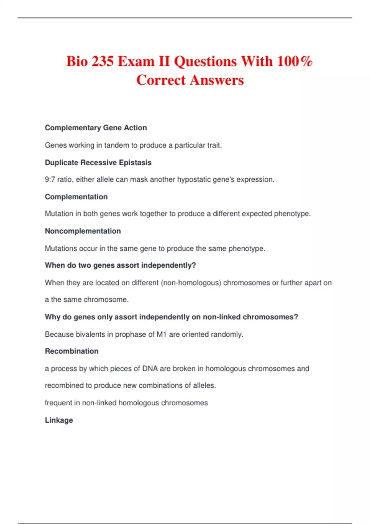 Bio 235 Exam II Questions With 100% Correct Answers Complementary Gene Action Genes working in tandem to produce a particular trait. Duplicate Recessive Epistasis 9:7 ratio, either allele can mask another hypostatic gene's expression. Complementation Mutation in both genes work together to produce a different expected phenotype. Noncomplementation Mutations occur in the same gene to produce the same phenotype. When do two genes assort independently? When they are located on different (non-homologous) chromosomes or further apart on a the same chromosome. Why do genes only assort independently on non-linked chromosomes? Because bivalents in prophase of M1 are oriented randomly. Recombination a process by which pieces of DNA are broken in homologous chromosomes and recombined to produce new combinations of alleles. frequent in non-linked homologous chromosomes Linkage alleles that are located in close proximity to each other on the same chromosome. They are more likely to be inherited and recombined together but cannot assort independently. How can you detect linkage? More parental gametes are produced than recombinant in the F2 because of a lack of independent assortment. recombination frequency proportion of recombinant progeny produced in a hybrid cross. 1% Rf = 1 centimorgan what is the RF in a testcross for an individual with linked genes? 50% >> Less than half what is the RF in a testcross for an individual with non-linked genes? 50% Relationship between distance and rf higher distance = higher rf, more genetic distance = more recombination frequency Linkage Group the collection of matched loci in a genome, term synonymous with a chromosome. Markers DNA polymorphisms used to highlight allele specific loci on a chromosome, analogous to signs along the highway. Why is RF a flawed measurement for genetic distance?