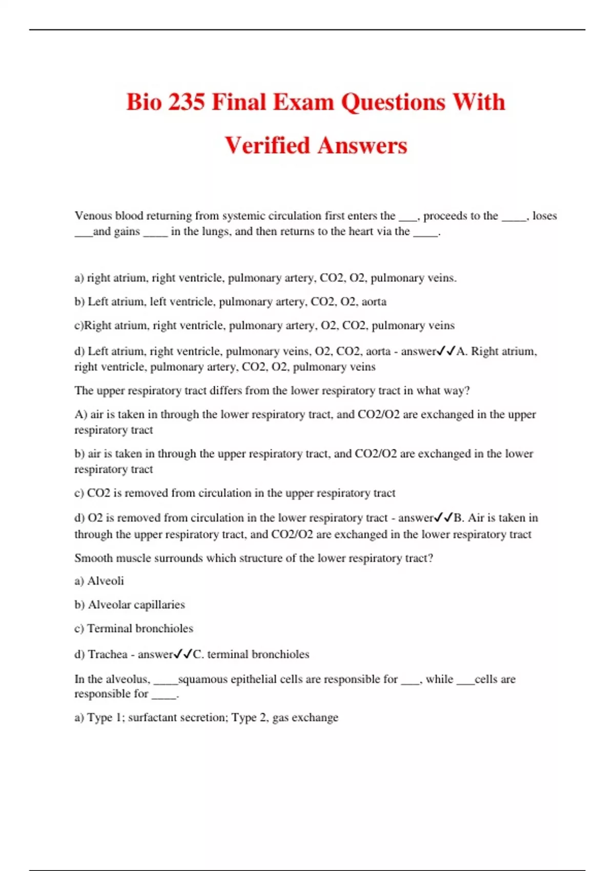 Bio 235 Final Exam Questions With Verified Answers Venous blood returning from systemic circulation first enters the ___, proceeds to the ____, loses ___and gains ____ in the lungs, and then returns to the heart via the ____. a) right atrium, right ventricle, pulmonary artery, CO2, O2, pulmonary veins. b) Left atrium, left ventricle, pulmonary artery, CO2, O2, aorta c)Right atrium, right ventricle, pulmonary artery, O2, CO2, pulmonary veins d) Left atrium, right ventricle, pulmonary veins, O2, CO2, aorta - answerA. Right atrium, right ventricle, pulmonary artery, CO2, O2, pulmonary veins The upper respiratory tract differs from the lower respiratory tract in what way? A) air is taken in through the lower respiratory tract, and CO2/O2 are exchanged in the upper respiratory tract b) air is taken in through the upper respiratory tract, and CO2/O2 are exchanged in the lower respiratory tract c) CO2 is removed from circulation in the upper respiratory tract d) O2 is removed from circulation in the lower respiratory tract - answerB. Air is taken in through the upper respiratory tract, and CO2/O2 are exchanged in the lower respiratory tract Smooth muscle surrounds which structure of the lower respiratory tract? a) Alveoli b) Alveolar capillaries c) Terminal bronchioles d) Trachea - answerC. terminal bronchioles In the alveolus, ____squamous epithelial cells are responsible for ___, while ___cells are responsible for ____. a) Type 1; surfactant secretion; Type 2, gas exchange b) type 1; debris removal; type 2; surfactant secretion c) type 3; debris removal; type 1; gas exchange d) type 1; gas exchange; type 2: surfactant secretion - answerd) type 1; gas exchange; type 2: surfactant secretion There is no net air flow into or out of the lungs when a) P alveolus = P atmostpher b) P alveolus< P atmostphere c) P pleural wall > P atmostphere d) P atmosphere< P pleural wall - answera) P alveolus = P atmosphere What keeps the lungs from collapsing Check the - answerb) trans pulmonary negative pressure caused by negative pressure from pleural cavity Identify the correct sequence of events for inspiration a) diaphragm & inspiratory intercostals relax, lungs expand, air flows into alveoli b) diaphragm & inspiratory intercostals contract; lungs expand, air flows out of the alveoli c) diaphragm & inspiratory intercostals contract, lungs expand, air flows into alveoli d)diaphragm & expiratory intercostals relax, lungs contract, air flows out of alveoli - answerc) diaphragm & inspiratory intercostals contract, lungs expand, air flows into alveoli the main determiners of lung compliance are a) lung tissue thickness, surface tension of fluid on the inner lung surface b) lung tissue perforations, surface tension of fluid on the inner lung surface c) lung tissue surface area, surface tension of fluid on the inner lung surface d) lung tissue thickness, surface tension of fluid on the outer lung surface - answera) lung tissue thickness, surface tension of fluid on the inner lung surface lung compliance is defined as a) lung volume/ transpulmonary pressure b) transpulmonary pressure/ lung volume c) transthoracic pressure/ atmospheric pressure d) none of the above - answerd) none of the above trained athletes tend to have a) increased lung compliance b) normal lung compliance c) decreased lung compliance d) asthma - answera) increased lung compliance which is true abbout the pleural sac a)it is continuous with the atmosphere and protects the lungs from infections b) it is a closed sac surrounding each lung and contains only a tiny volume of lubricating fluid c) it is a closed sac surrounding each lung and contain a large volume of surfactact d) it is a closed, air-filled space surrounding both lungs that has a negative pressure compared to atmospheric pressure - answerb) it is a closed sac surrounding each lung and contains only a tiny volume of lubricating fluid which structure is NOT part of the "anatomical dead space?" a) bronchiole b) trachea c) bronchus d)respiratory bronchiole - answerd)respiratory bronchiole the volume of air flowing into the alveoli during inhalation/inspiration is increased when there is an increase in which of these? a)air resistance b)the pressure gradiant from the atmosphere to the alveoli c) the pressure in the intrapleural space d) the curvature of the diaphragm - answerb)the pressure gradiant from the atmosphere to the alveoli under normal circumstances, which of the following would result from an increase in transpulmonary pressure? a) inhalation/inspiration b) exhalation/expiration c) a collapsed lung d) emphysema - answera) inhalation/inspiration which of the following statements about the response of arteriole smooth muscle to changing ocygen partial pressure is true? a) both systemic and pulmonary arterioles respond to a decrease in PO2 by constricting b) both systemic and pulmonary arterioles respond to a decrease in PO2 by dilating c) systemic arterioles respond to a decrease in PO2 by dilating but pulmonary arterioles constrict in response to decreased PO d) systemic arterioles respond to a decrease in PO2 by constricting but pulmonary arterioles dilate in response to decreased PO2 - answerc) systemic arterioles respond to a decrease in PO2 by dilating but pulmonary arterioles constrict in response to decreased PO during an unforced exhalation/expiration, which would NOT be true? a) alveolar pressure is greater than atmospheric pressure b) intrapleural pressure is greater than alveolar pressure c) intrapleural pressure becomes less negative d) the diaphragm relaxes - answerb) intrapleural pressure is greater than alveolar pressure which true regarding how gases dissolve in liquids? a0 the concentration of a gas in a liquid equilibrates to match the concentration of that gas in the air to which of the liquid is exposed b) different gasses have the same solubility in liquids c) the partial pressure of a gas in a liquid is equal to the amount greatly diffusing in the liquid plus th