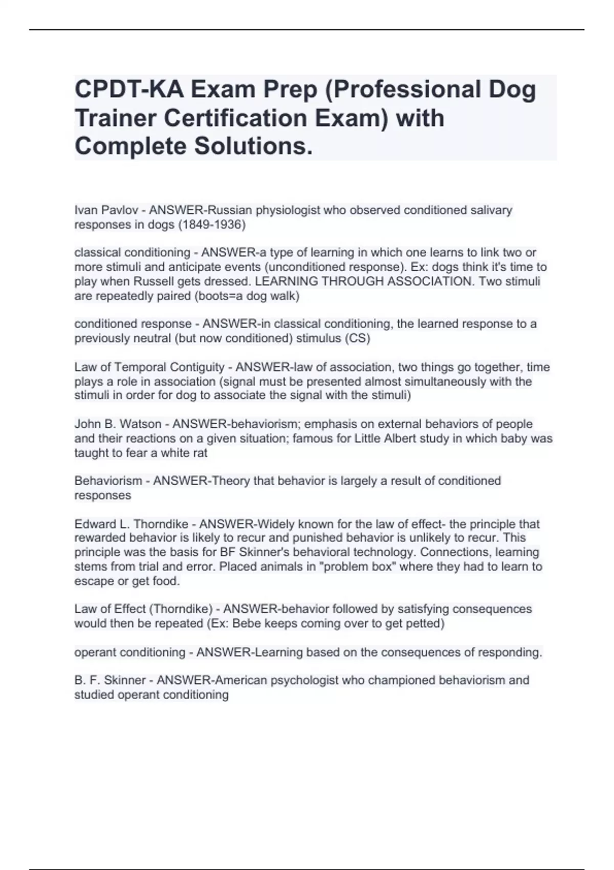 Ivan Pavlov - ANSWER-Russian physiologist who observed conditioned salivary responses in dogs () classical conditioning - ANSWER-a type of learning in which one learns to link two or more stimuli and anticipate events (unconditioned response). Ex: dogs think it's time to play when Russell gets dressed. LEARNING THROUGH ASSOCIATION. Two stimuli are repeatedly paired (boots=a dog walk) conditioned response - ANSWER-in classical conditioning, the learned response to a previously neutral (but now conditioned) stimulus (CS) Law of Temporal Contiguity - ANSWER-law of association, two things go together, time plays a role in association (signal must be presented almost simultaneously with the stimuli in order for dog to associate the signal with the stimuli) John B. Watson - ANSWER-behaviorism; emphasis on external behaviors of people and their reactions on a given situation; famous for Little Albert study in which baby was taught to fear a white rat Behaviorism - ANSWER-Theory that behavior is largely a result of conditioned responses Edward L. Thorndike - ANSWER-Widely known for the law of effect- the principle that rewarded behavior is likely to recur and punished behavior is unlikely to recur. This principle was the basis for BF Skinner's behavioral technology. Connections, learning stems from trial and error. Placed animals in "problem box" where they had to learn to escape or get food. Law of Effect (Thorndike) - ANSWER-behavior followed by satisfying consequences would then be repeated (Ex: Bebe keeps coming over to get petted) operant conditioning - ANSWER-Learning based on the consequences of responding. B. F. Skinner - ANSWER-American psychologist who championed behaviorism and studied operant conditioning Reinforcement - ANSWER-in operant conditioning, any event that strengthens or weakens the behavior it follows David Premack - ANSWER-theorized about how a reinforcer's value could be determined Premack Principle - ANSWER-The concept, developed by David Premack, that a more-preferred activity can be used to reinforce a less-preferred activity. Also called "Grandma's Rule": how can you have any pudding if you don't eat your meat? Sit before playing.