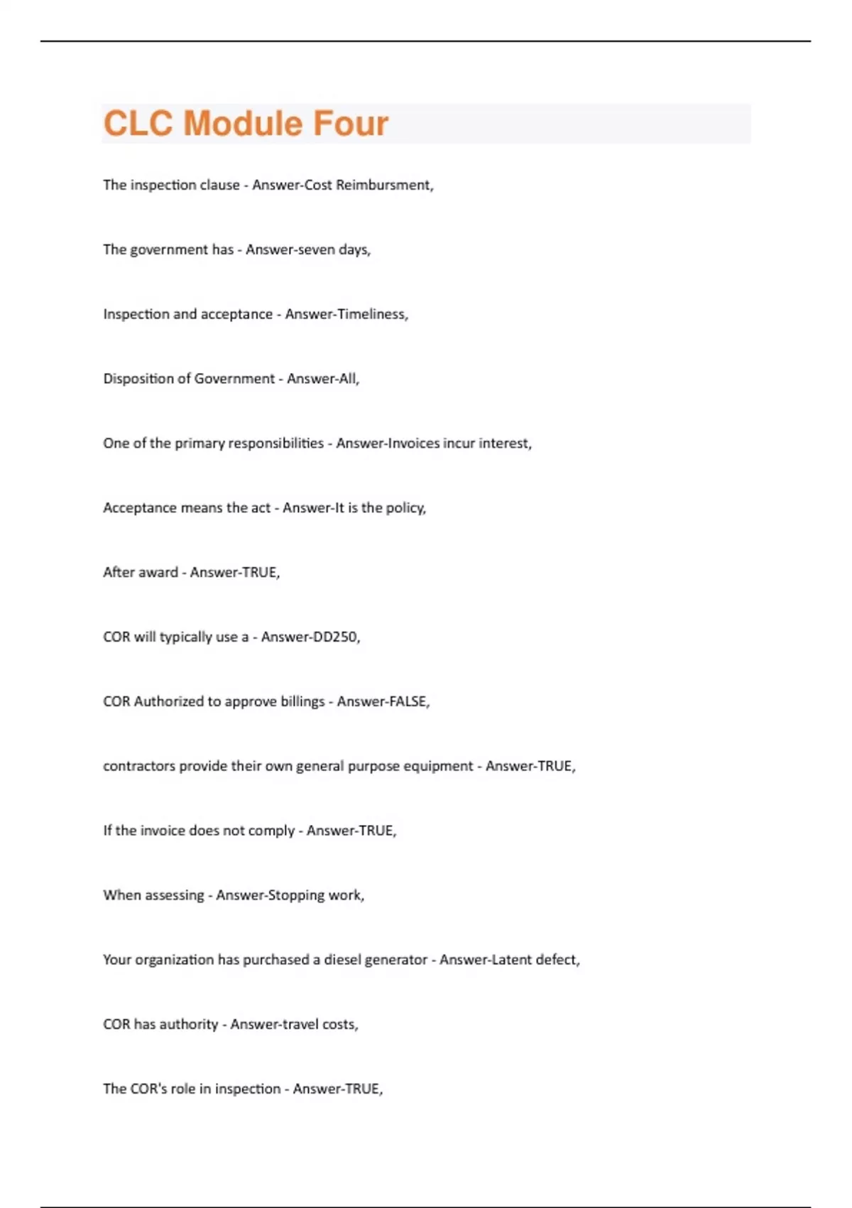 The inspection clause - Answer-Cost Reimbursment, The government has - Answer-seven days, Inspection and acceptance - Answer-Timeliness, Disposition of Government - Answer-All, One of the primary responsibilities - Answer-Invoices incur interest, Acceptance means the act - Answer-It is the policy, After award - Answer-TRUE, COR will typically use a - Answer-DD250, COR Authorized to approve billings - Answer-FALSE, contractors provide their own general purpose equipment - Answer-TRUE, If the invoice does not comply - Answer-TRUE, When assessing - Answer-Stopping work, Your organization has purchased a diesel generator - Answer-Latent defect, COR has authority - Answer-travel costs, The COR's role in inspection - Answer-TRUE,The government must notify the contractor - Answer-monies are witheld, only the government input is recorded - Answer-FALSE, An example of a government obligation - Answer-payment to the contractor, Which of the following is not a common problem found during invoice review - Answer-EFT information, contractors are generally not held liable - Answer-all, past performance assessments include input from the - Answer-all, if the contractor delivers a non-conforming - Answer-contracting officer,