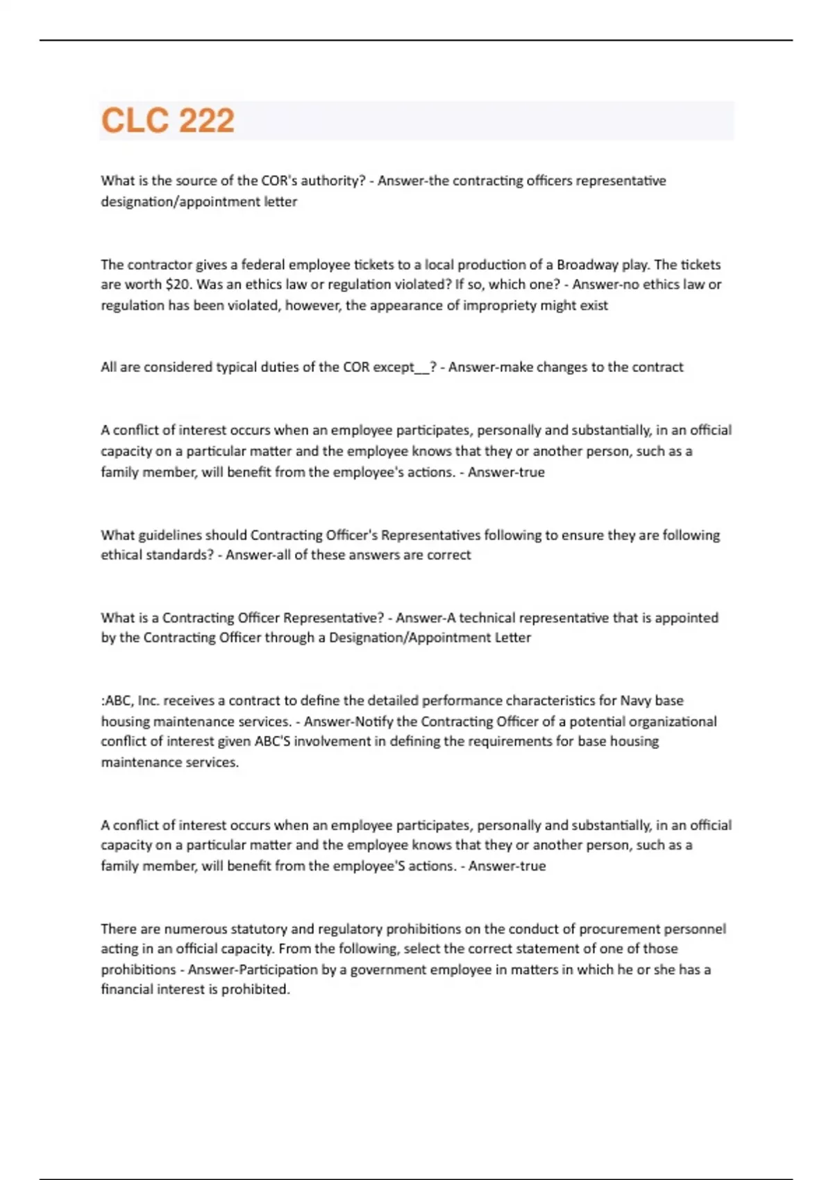 What is the source of the COR's authority? - Answer-the contracting officers representative designation/appointment letter The contractor gives a federal employee tickets to a local production of a Broadway play. The tickets are worth $20. Was an ethics law or regulation violated? If so, which one? - Answer-no ethics law or regulation has been violated, however, the appearance of impropriety might exist All are considered typical duties of the COR except__? - Answer-make changes to the contract A conflict of interest occurs when an employee participates, personally and substantially, in an official capacity on a particular matter and the employee knows that they or another person, such as a family member, will benefit from the employee's actions. - Answer-true What guidelines should Contracting Officer's Representatives following to ensure they are following ethical standards? - Answer-all of these answers are correct What is a Contracting Officer Representative? - Answer-A technical representative that is appointed by the Contracting Officer through a Designation/Appointment Letter :ABC, Inc. receives a contract to define the detailed performance characteristics for Navy base housing maintenance services. - Answer-Notify the Contracting Officer of a potential organizational conflict of interest given ABC'S involvement in defining the requirements for base housing maintenance services. A conflict of interest occurs when an employee participates, personally and substantially, in an official capacity on a particular matter and the employee knows that they or another person, such as a family member, will benefit from the employee'S actions. - Answer-true There are numerous statutory and regulatory prohibitions on the conduct of procurement personnel acting in an official capacity. From the following, select the correct statement of one of those prohibitions - Answer-Participation by a government employee in matters in which he or she has a financial interest is prohibited.You are the COR at a Government training installation. During a class session, there is a contractor performing noisy construction work in the adjacent hallway. The instructor requests that you tell the noisy contractor to discontinue work until after class. You should request that the contractor take a break until class has ended - Answer-false Regarding the COR's key duties, choose the correct statement from the following: - Answer-The COR should know the contract and provide technical direction and guidance The contractor paid $85 for a federal employee'S dinner. Was an ethics law or regulation violated? If so, which one? - Answer-Yes, 41 U.S.C. 423 ? Procurement Integrity Act